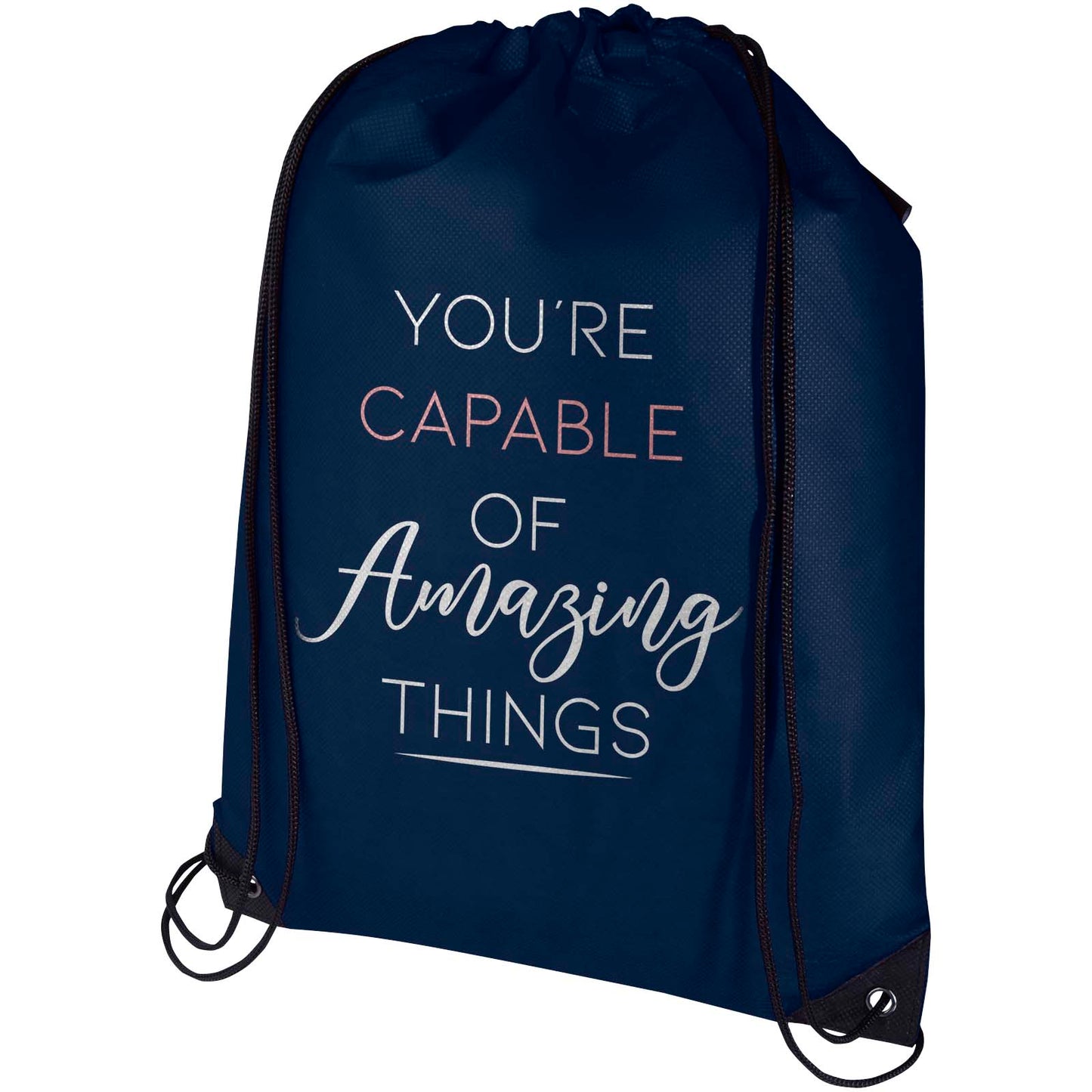 "Realizzata in tessuto non tessuto in PET riciclato e certificato GRS, durevole e resistente agli strappi, la borsa con cordoncino Evergreen è un'ottima opzione se si cerca un omaggio maneggevole per promuovere il marchio o una campagna di marketing. Questa borsa leggera è economica e presenta un design con cordoncino che permette di portarla sulla spalla o come zaino. Capacità: 5 litri. Resistenza fino a 5 kg di peso."