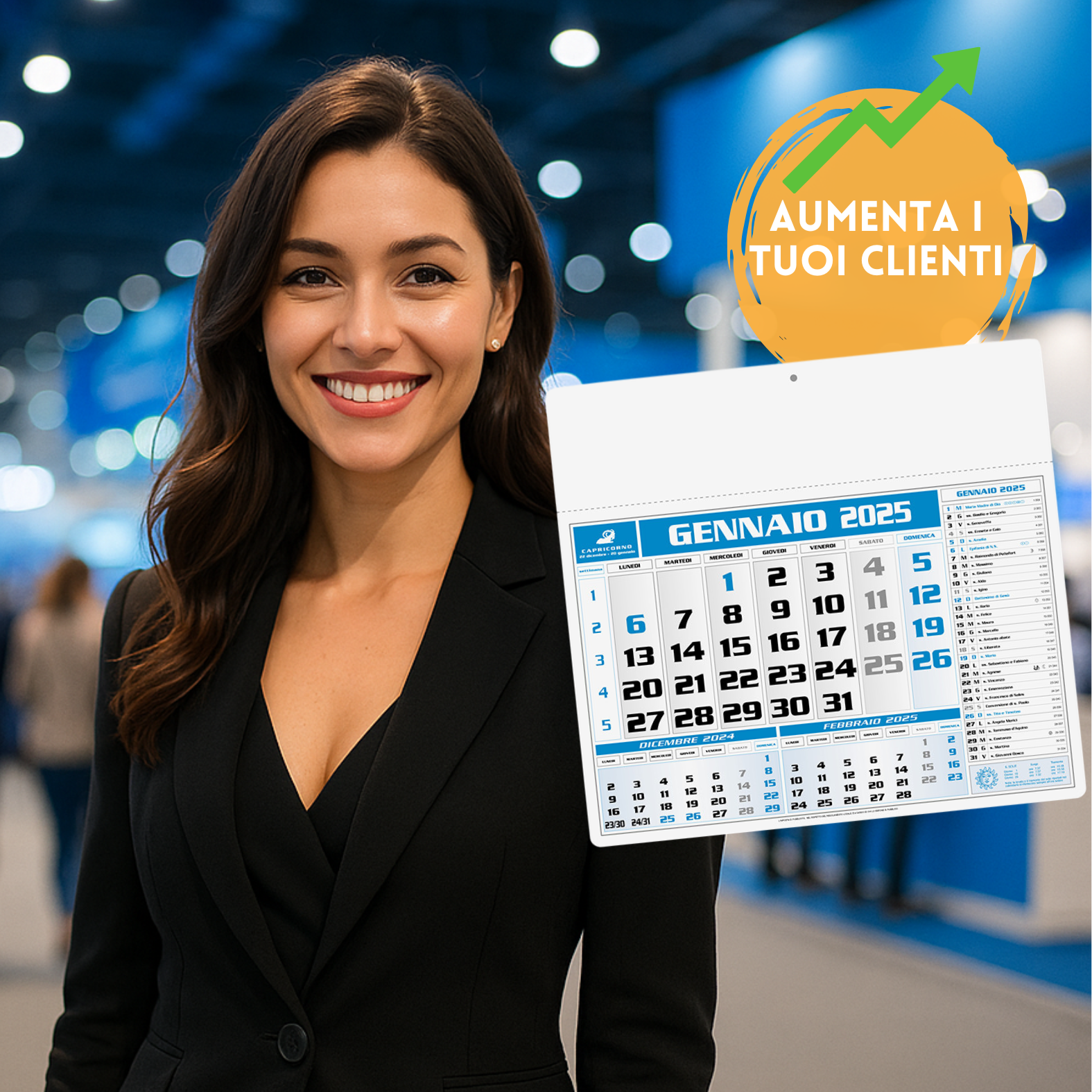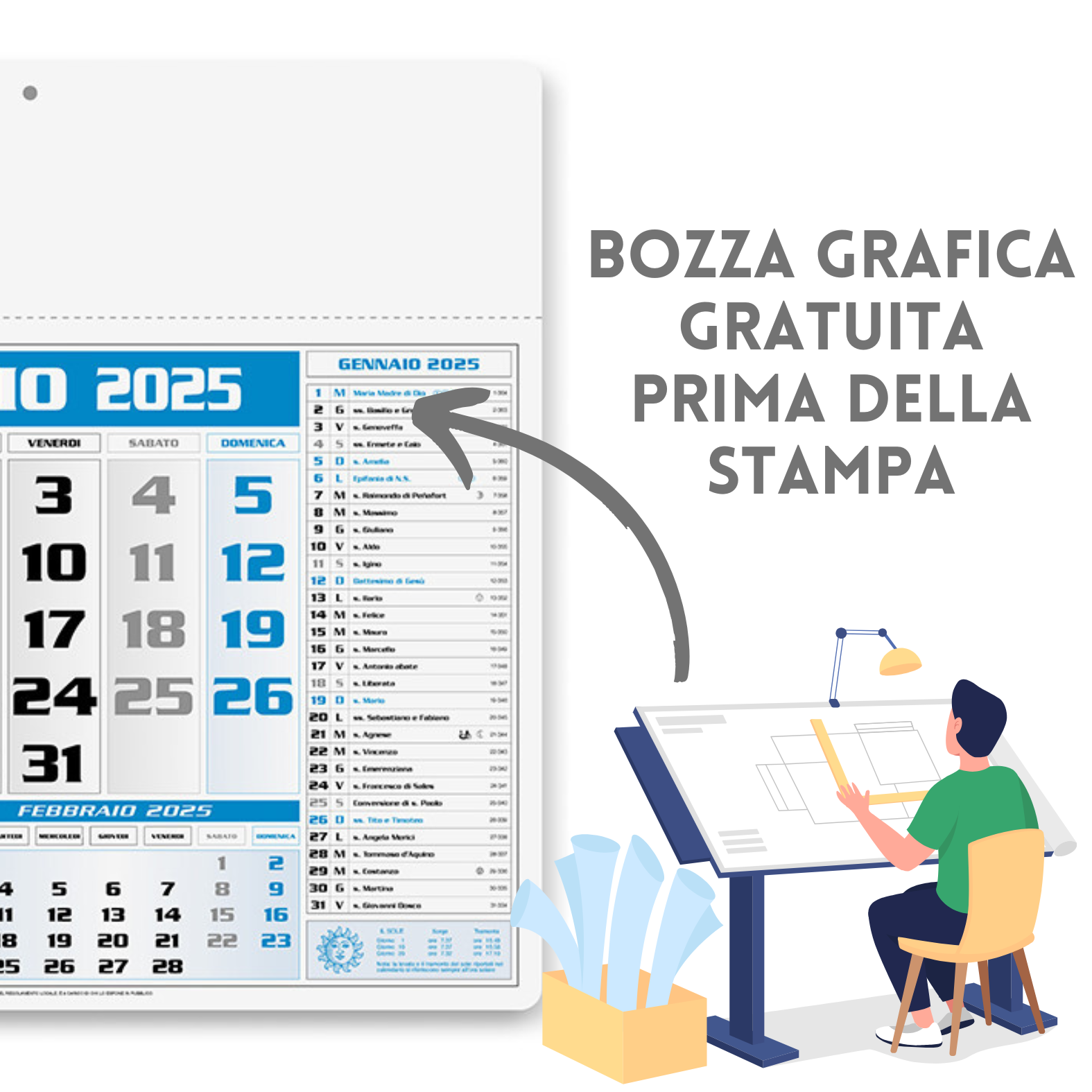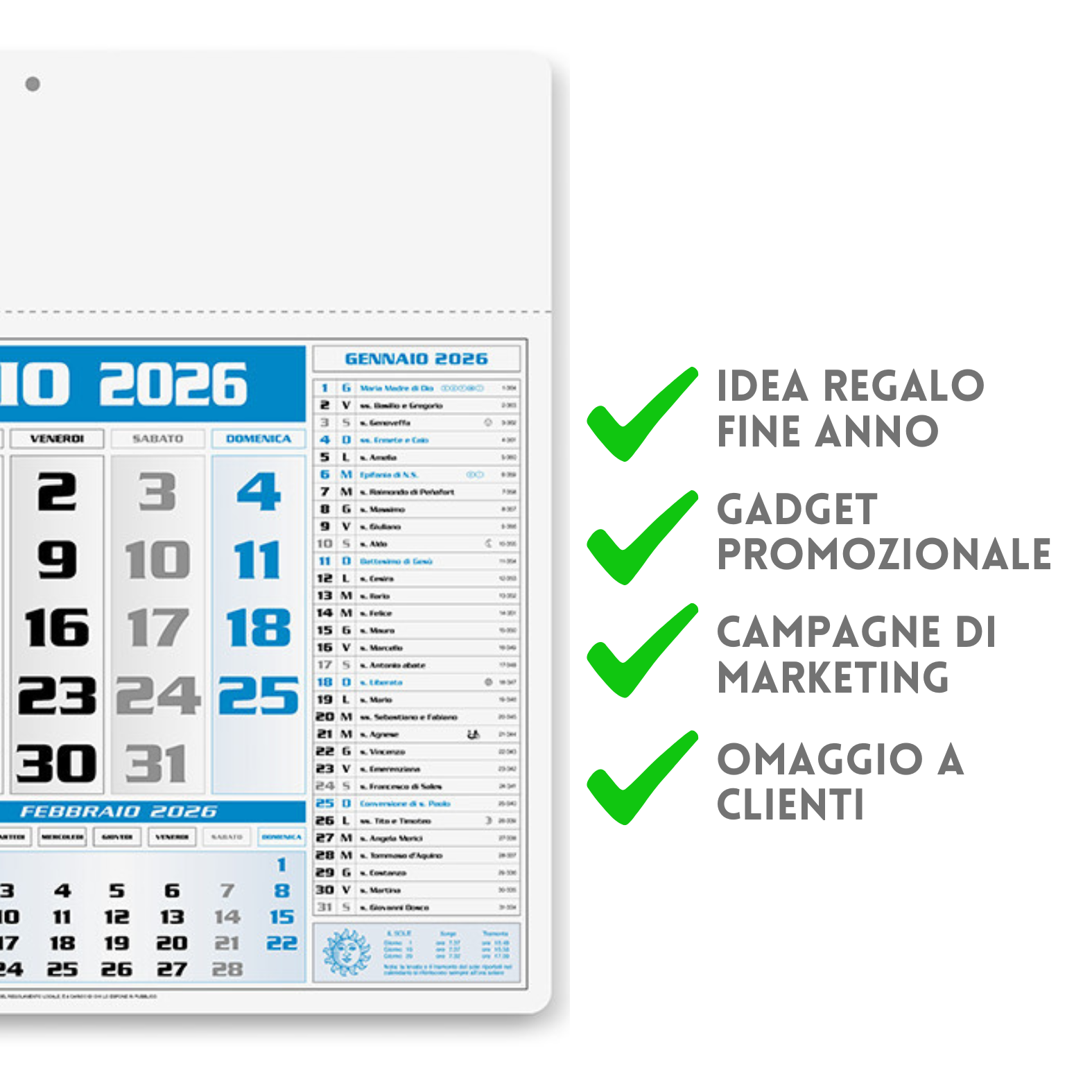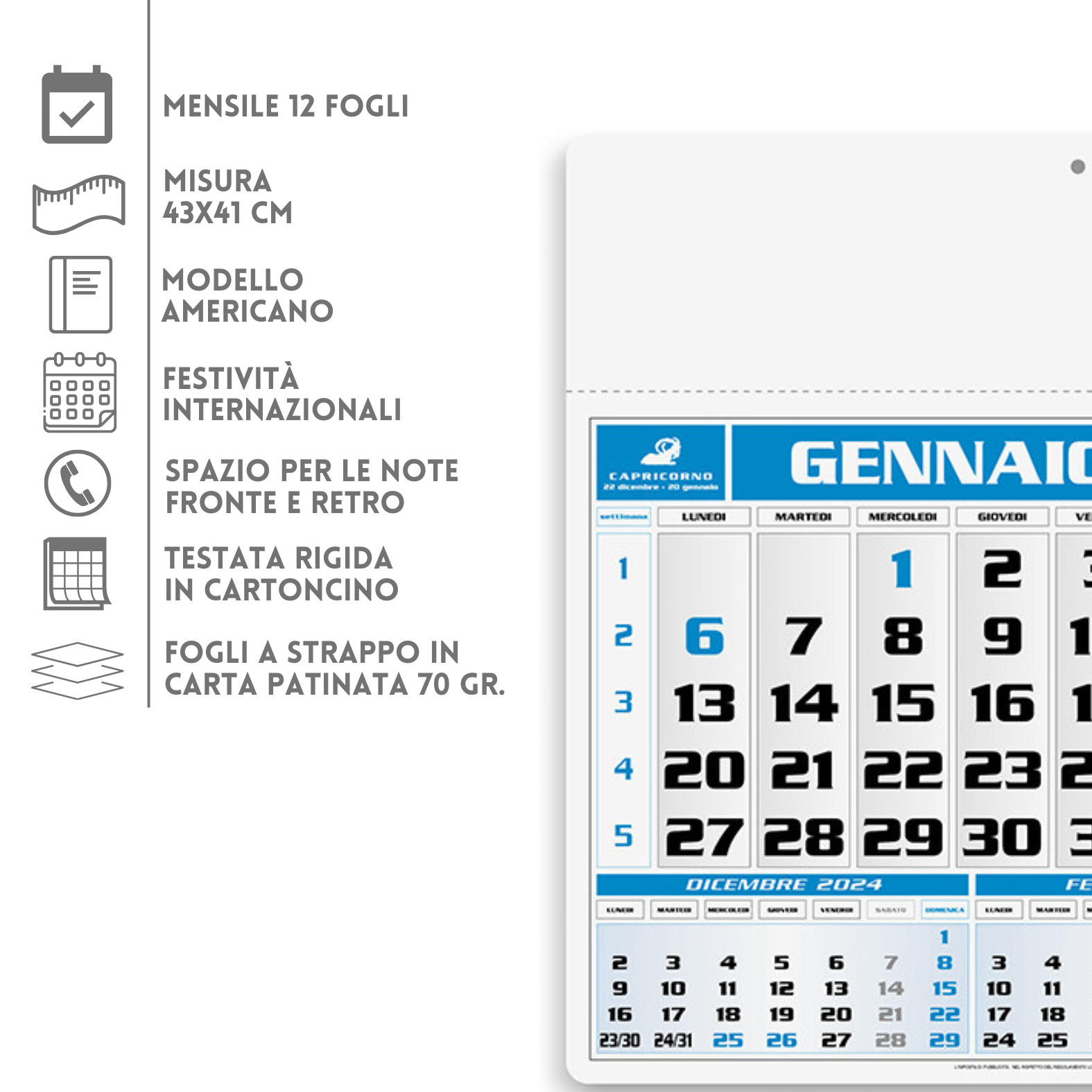 Calendari olandesi personalizzati 2026 da muro modello Americano con numeri grandi. Misura 43x41 cm con ampio spazio note sul fronte. Realizzato in carta naturale 70 gr. 12 Fogli con stampa su testata in cartoncino. Prodotto ideale per aumentare la fidelizzazione dei tuoi clienti e come omaggio di fine anno per la tua clientela. FORNITO CON STAMPA DIRETTA 1 COLORE INCLUSA NEL PREZZO.
