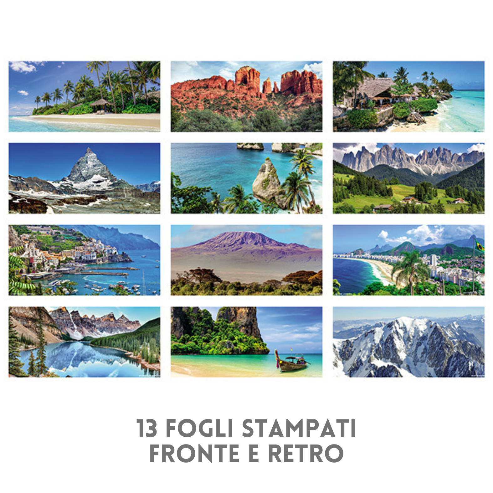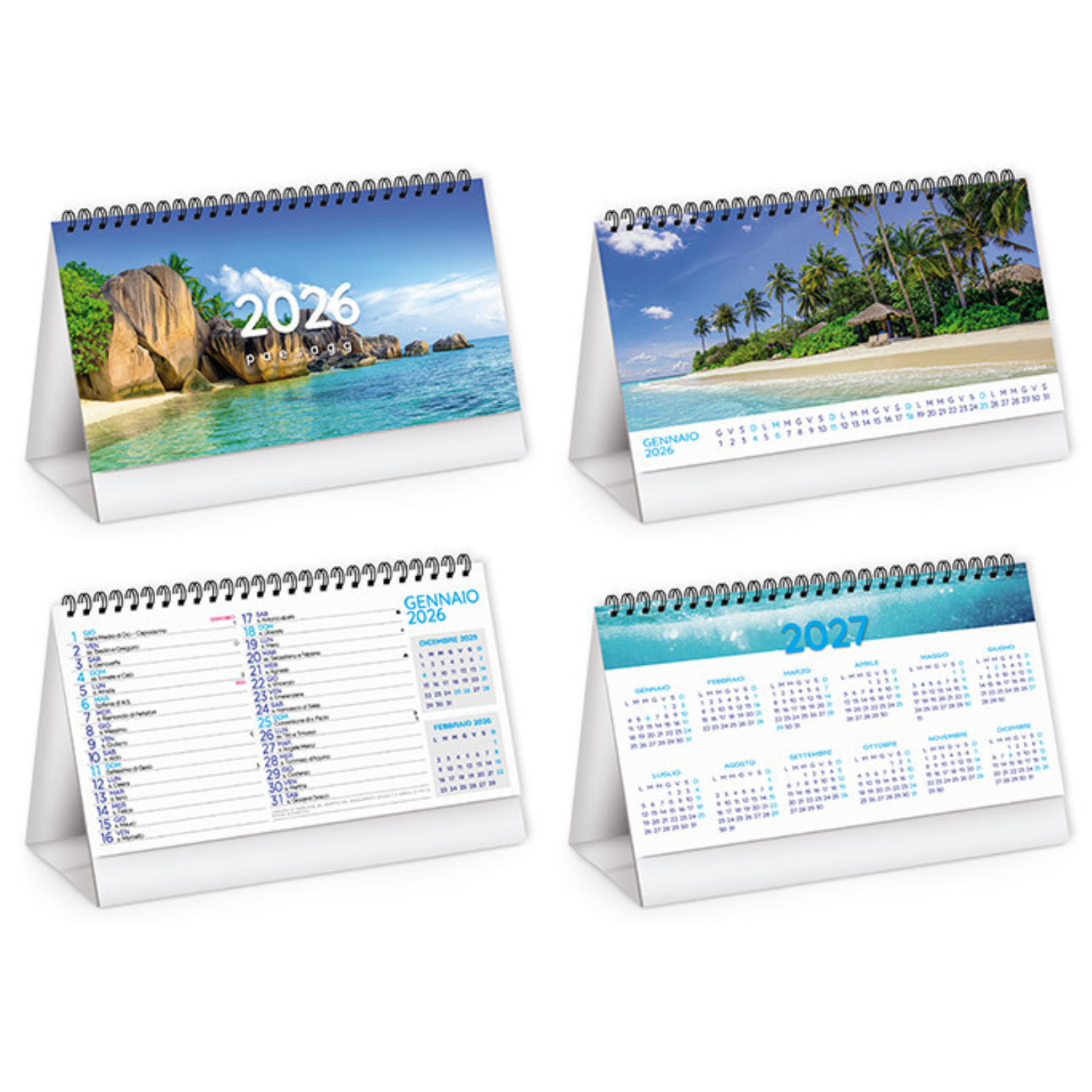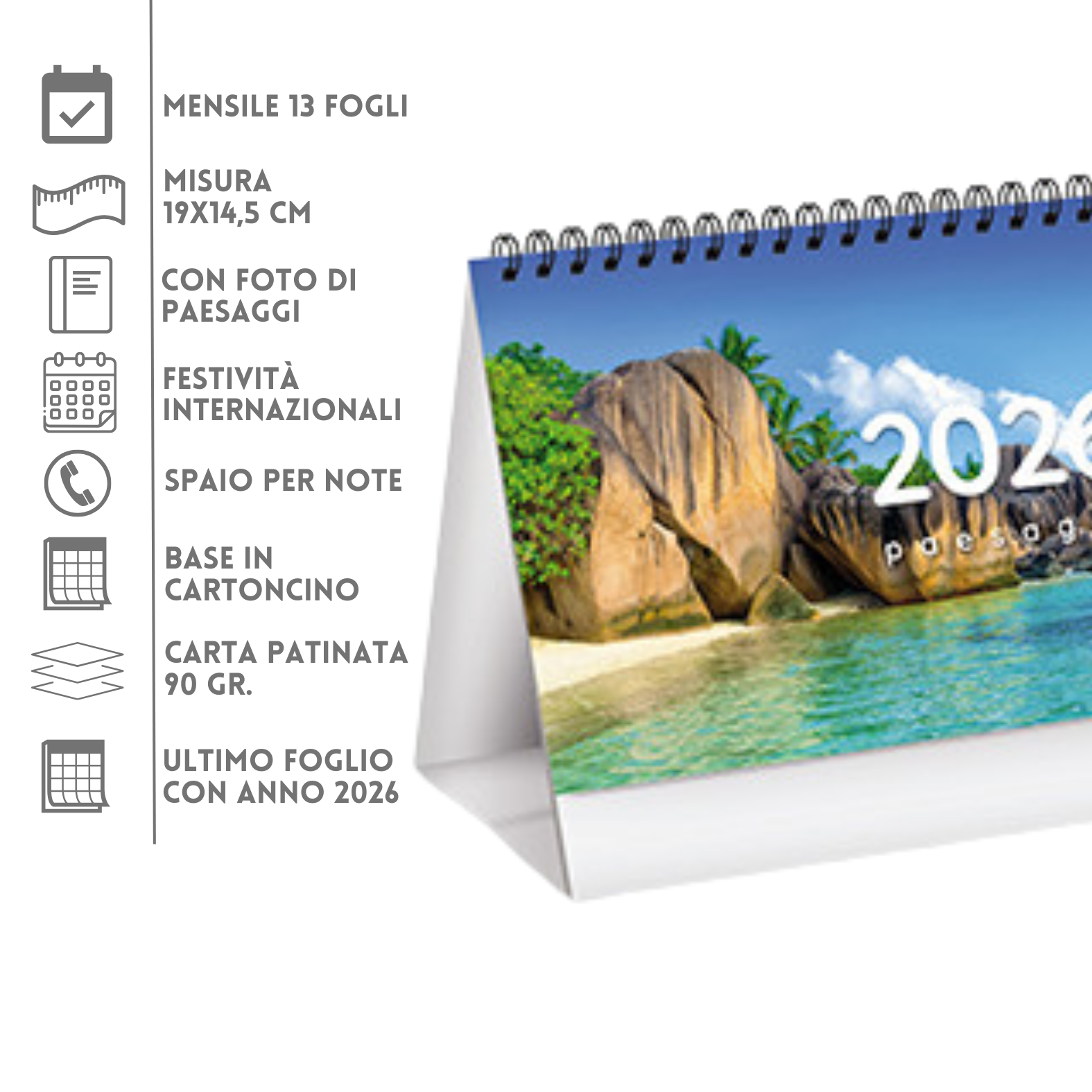 Calendario illustrato da banco con illustrazioni a tema Paesaggi. Composto da 13 fogli cn stampa fronte con mesi e spazio note e retro con foto di meravigliosi paesaggi dal mondo. Ultima pagina con anno 2027. Stampato su baase in cartoncino su 2 lati opposti. Misura 19x14,5 cm. Area di stampa 19x3,5 cm.