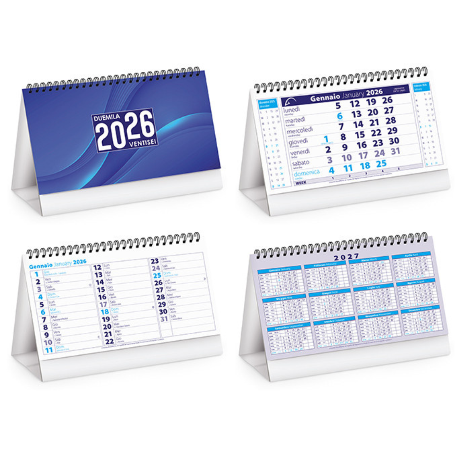 Calendario da banco modello classico olandese. Composto da 13 fogli cn stampa fronte con mesi e spazio note. Ultima pagina con anno 2027. Stampato su base in cartoncino su 2 lati opposti. Misura 19x14,5 cm. Area di stampa 19x3,5 cm.