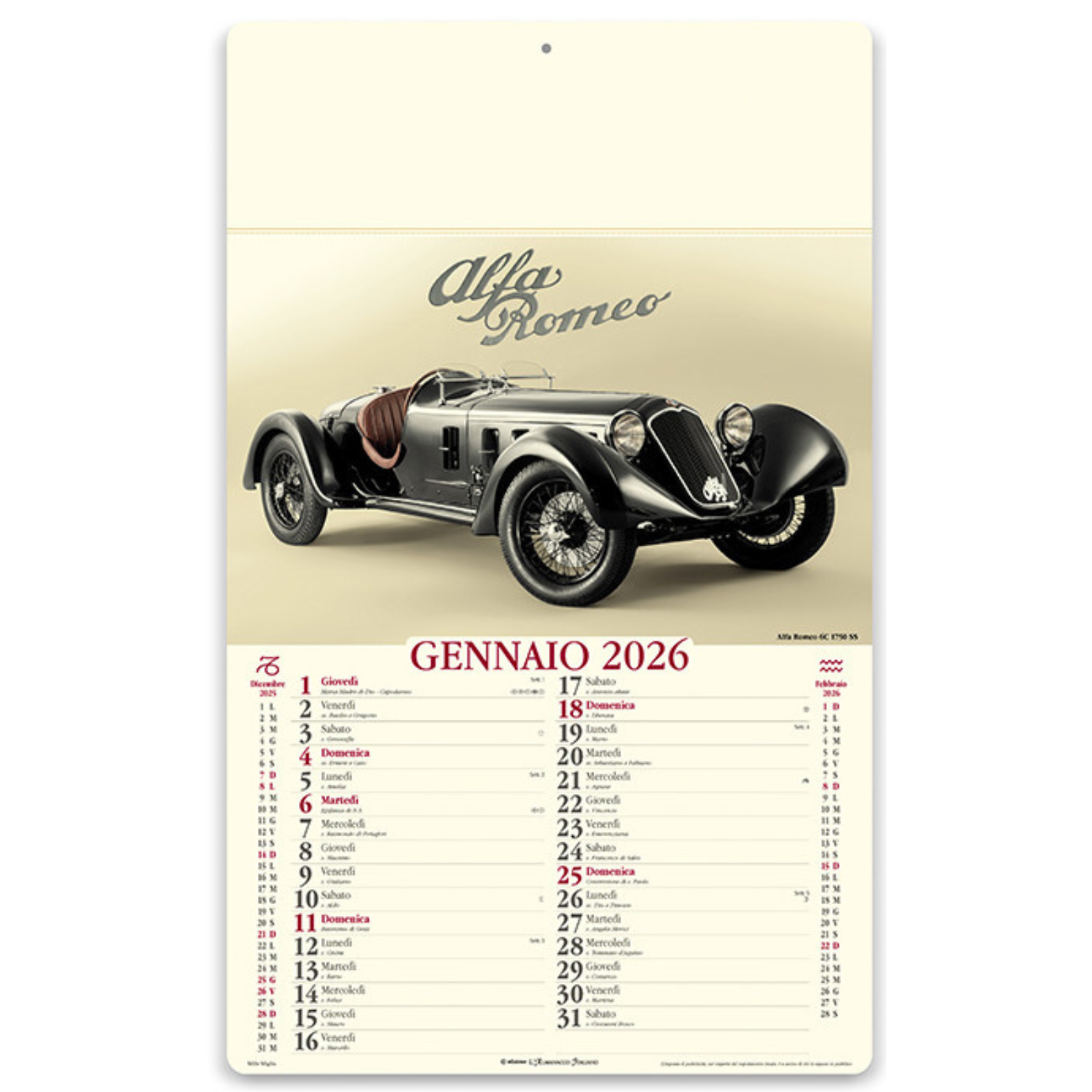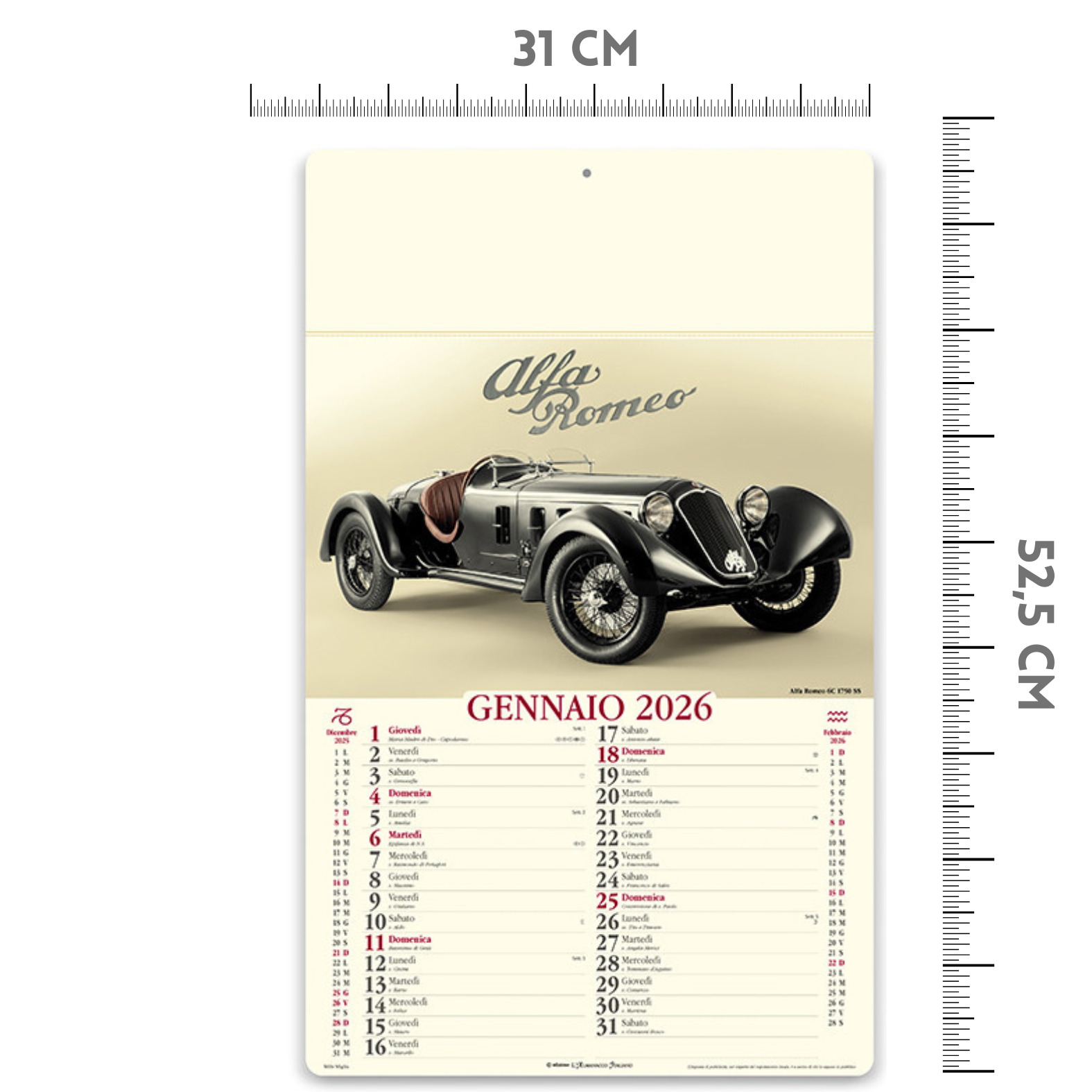 Calendari illustrati personalizzati 2026 da muro mille miglia con meravigliose illustrazioni di auto sportive d'epoca. Misura 31x52,5 cm con testata ad angoli arrotondati. Realizzato in carta naturale 70 gr. 12 Fogli con stampa su testata ad 1 colore. Prodotto ideale per aumentare la fidelizzazione dei tuoi clienti e come omaggio di fine anno per la tua clientela.