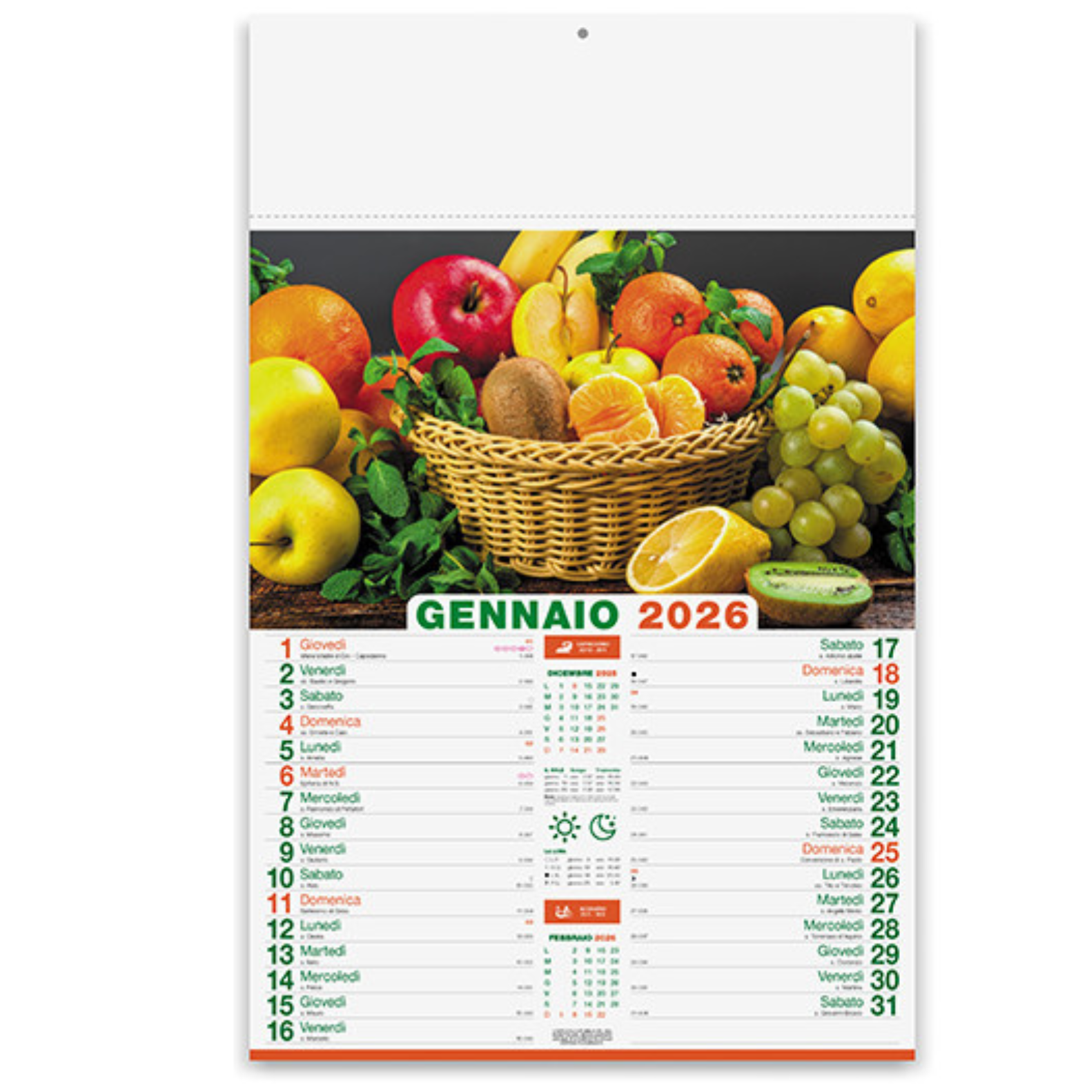 Calendari illustrati personalizzati 2026 da muro modello Frutta e Verdura. Misura 30X47 cm con illustrazioni sul fronte e informazioni sul retro. Realizzato in carta patinata 70 gr. e 12 Fogli con stampa su testata. Prodotto ideale per aumentare la fidelizzazione dei tuoi clienti e come omaggio di fine anno per la tua clientela.