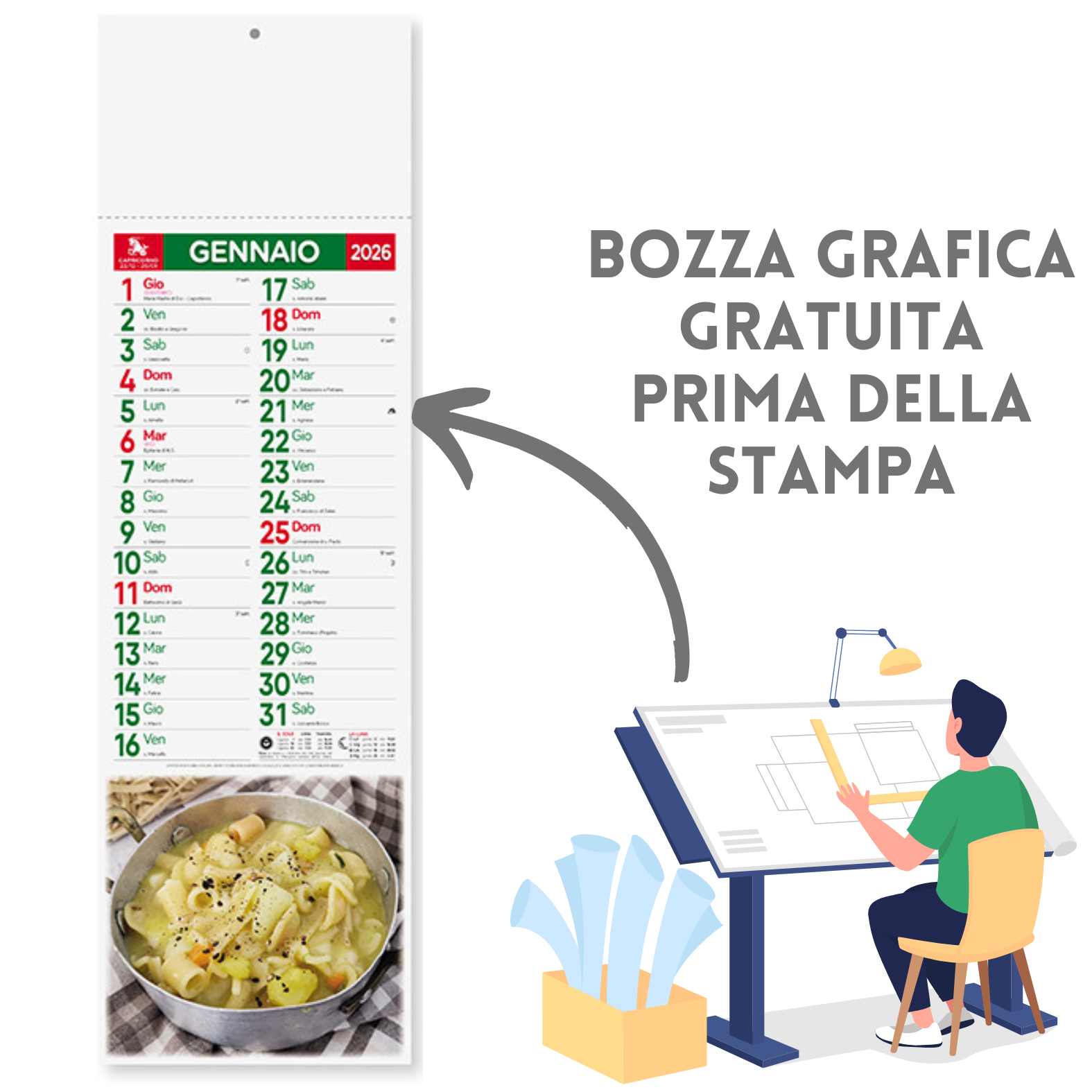 Calendari illustrati personalizzati 2026 da muro modello Gastronomia Slim. Misura 14X47 cm con illustrazioni sul fronte e informazioni sul retro. Realizzato in carta patinata 70 gr. e 12 Fogli con stampa su testata. Prodotto ideale per aumentare la fidelizzazione dei tuoi clienti e come omaggio di fine anno per la tua clientela.