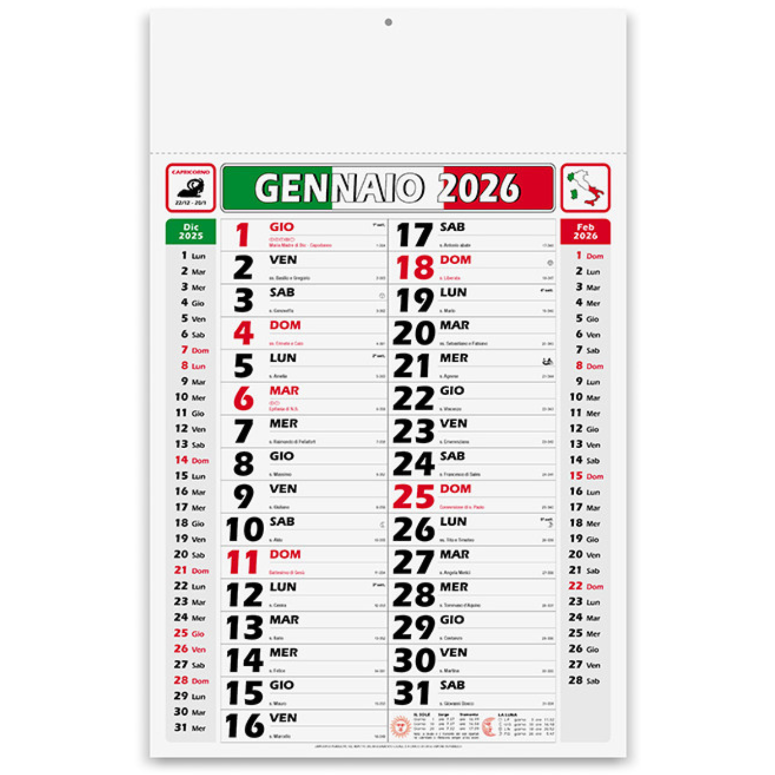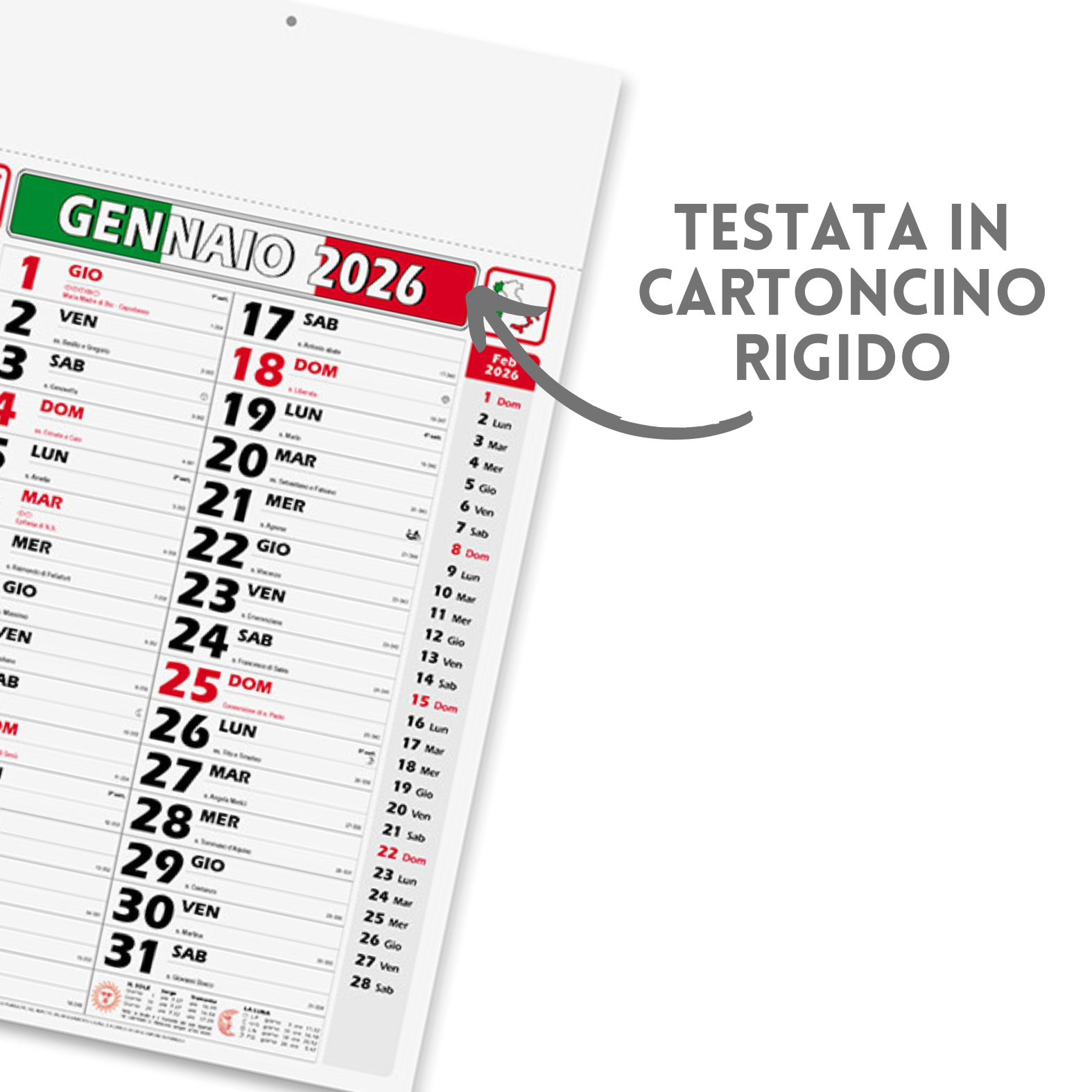 Calendari olandesi personalizzati 2026 da muro modello ITALY. Misura 29x47 cm con ampio spazio note sul fronte ed intero foglio sul retro. Realizzato in carta lucida 70 gr. 12 Fogli con stampa su testata in cartoncino. Prodotto ideale per aumentare la fidelizzazione dei tuoi clienti e come omaggio di fine anno per la tua clientela.