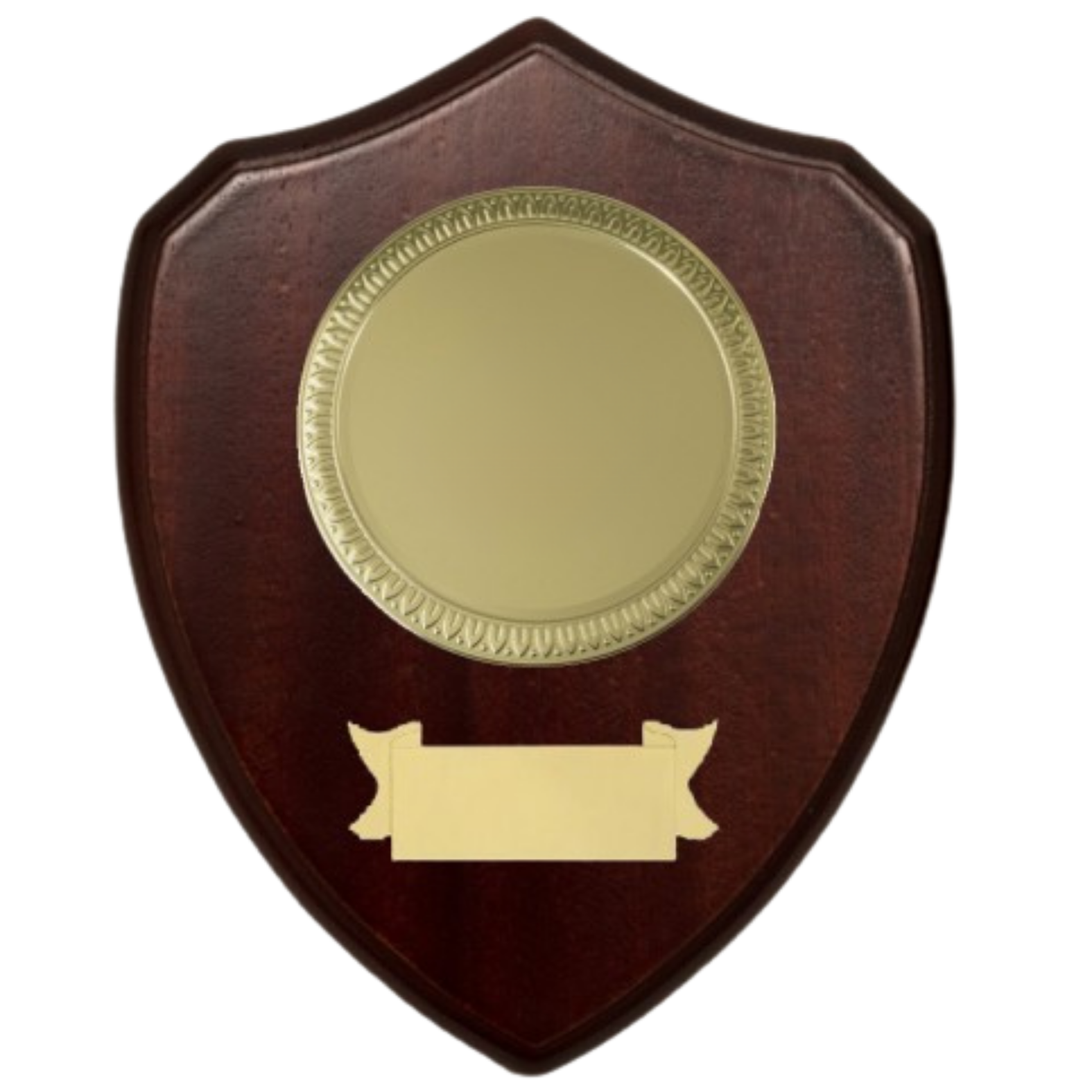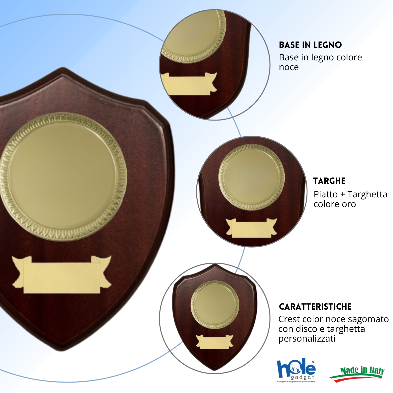 Crest ricordo 22,5x18 cm in legno color mogano con disco e cartiglio color oro. Realizzati con personalizzazione a colori inclusa nel prezzo.