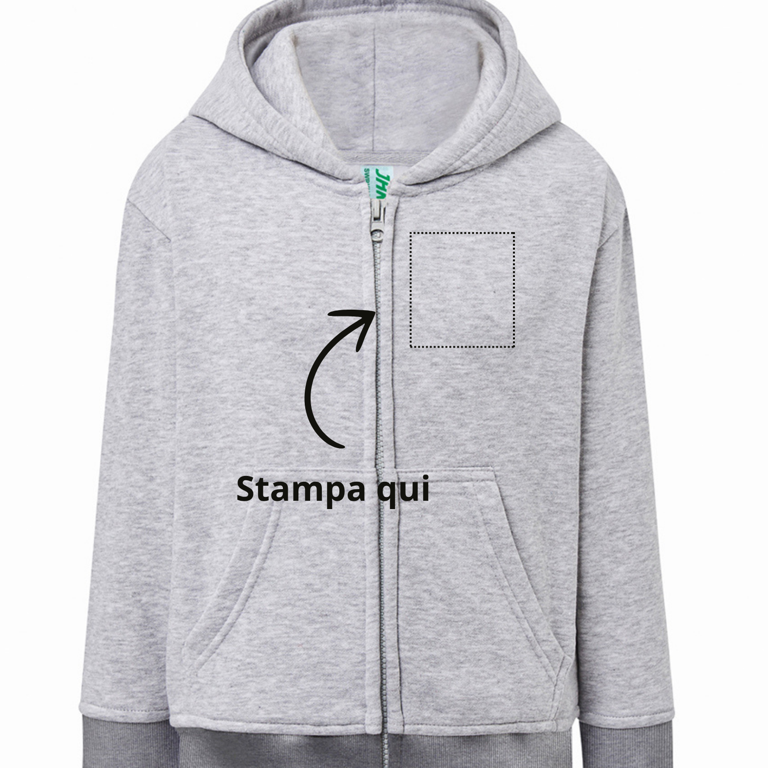 Felpa personalizzata da bambino 60% cotone, 40% poliestere. Felpa maniche lunghe bambino. cappuccio, cordino in tinta e zip intera. Costina 1x1 con Lycra su polsini e girovita. Fornita con stampa inclusa, ricamo su richiesta.