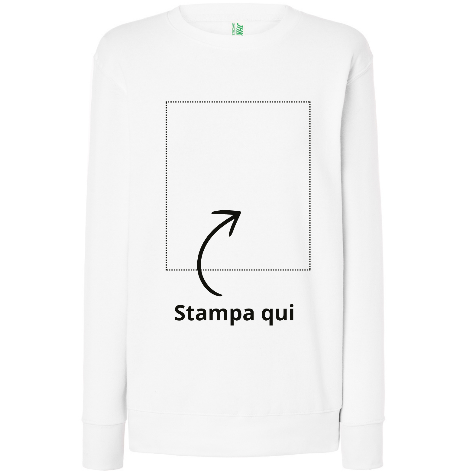 Felpa donna personalizzata realizzata in 60% COTONE + 40% POLIESTERE. Cuciture rinforzate su collo, polsini e fondo per una durata superiore. Peso 249 gr. Fornita con personalizzazione.
