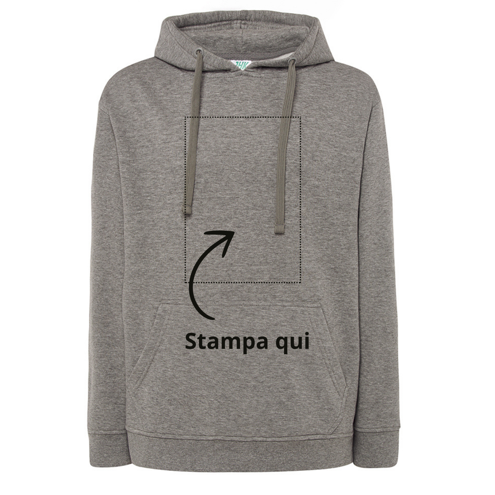 Felpa unisex a zip intera personalizzata realizzata in 60% COTONE + 40% POLIESTERE. Felpa con cappuccio e cordino in tinta, Costine 1x1 polsini e fondo in lycra, modello leggero in French Terry e tasche a marsupio. Taglie dalla S alla 3XL. Fornite con stampa e ricamo a richiesta.