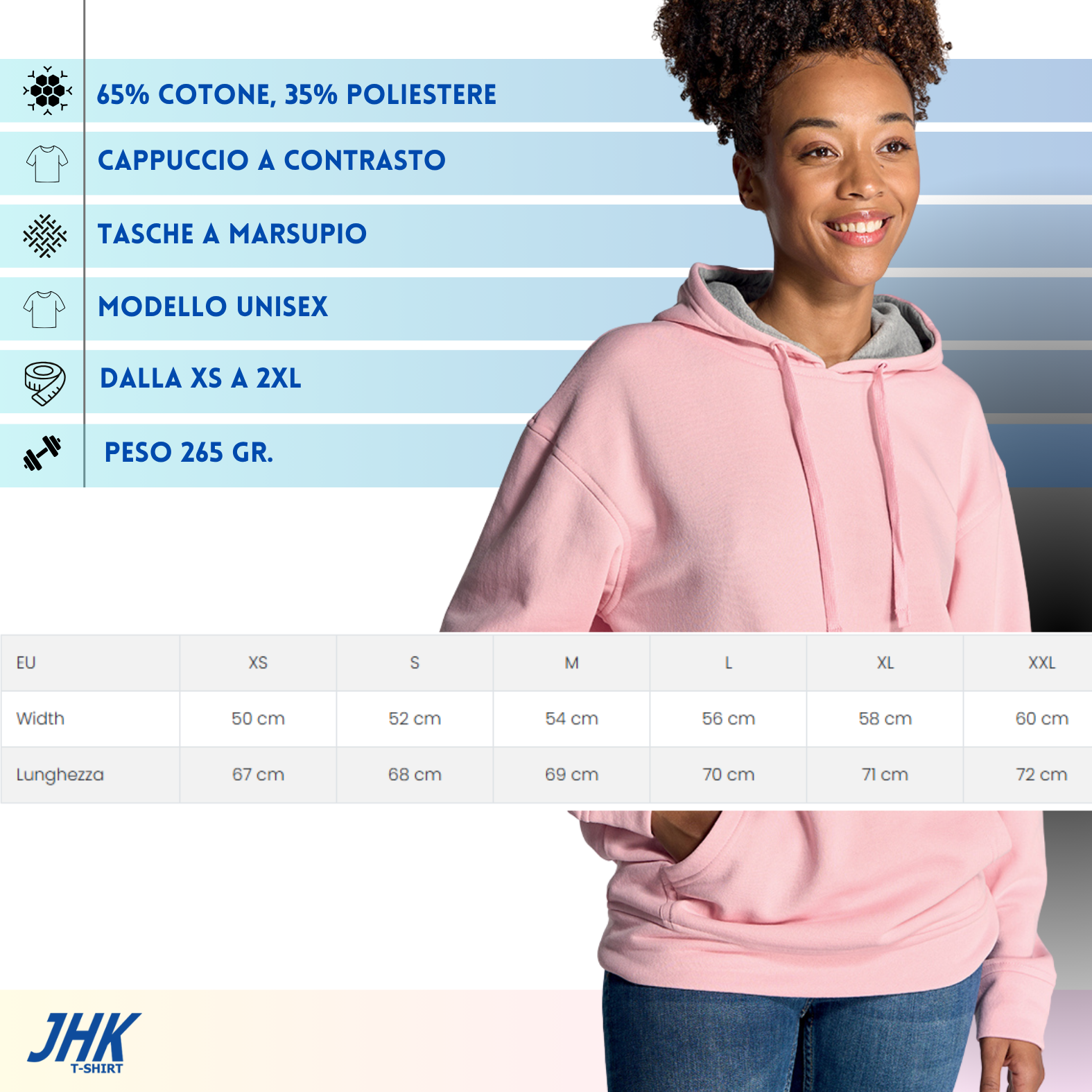 Felpa unisex personalizzata realizzata in 65% COTONE + 35% POLIESTERE. Felpa con cappuccio con colori a contrasto, laccetto in tinta e tascone a marsupio. Doppia cucitura su collo, polsini e orlo. Peso 265 gr. Fornita con stampa personalizzata, ricamo su richiesta.