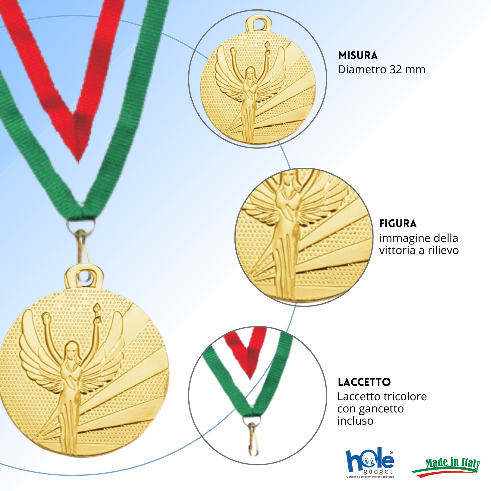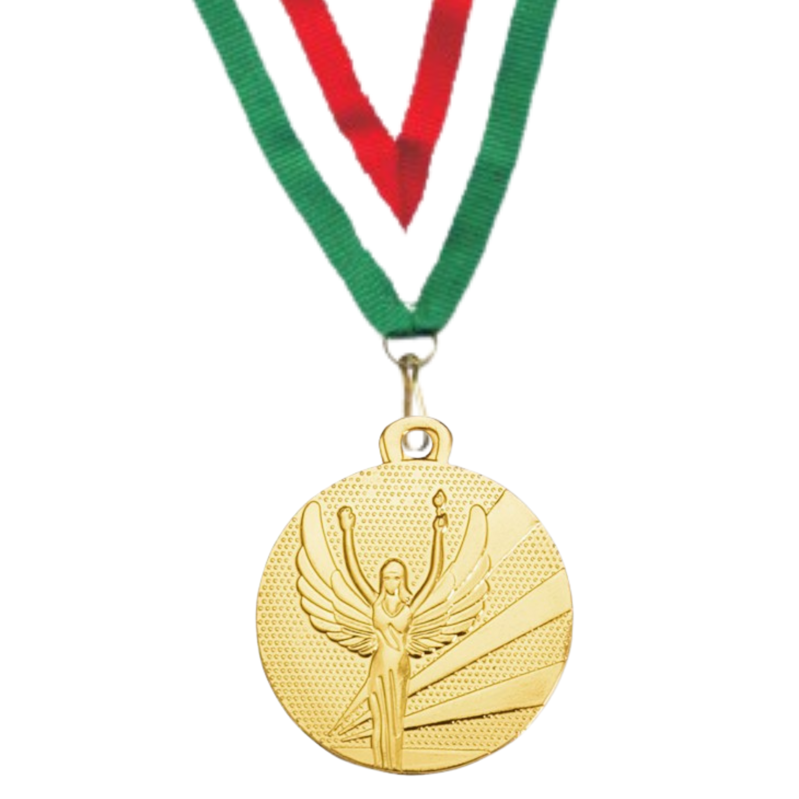 Medaglia personalizzata a colori sul retro, colorazione oro con raffigurazione vittoria a rilievo sul fronte. Interamente in metallo. Completa di nastro tricolore con gancio. Ideale per tutte le tipologie di sport ed eventi.
