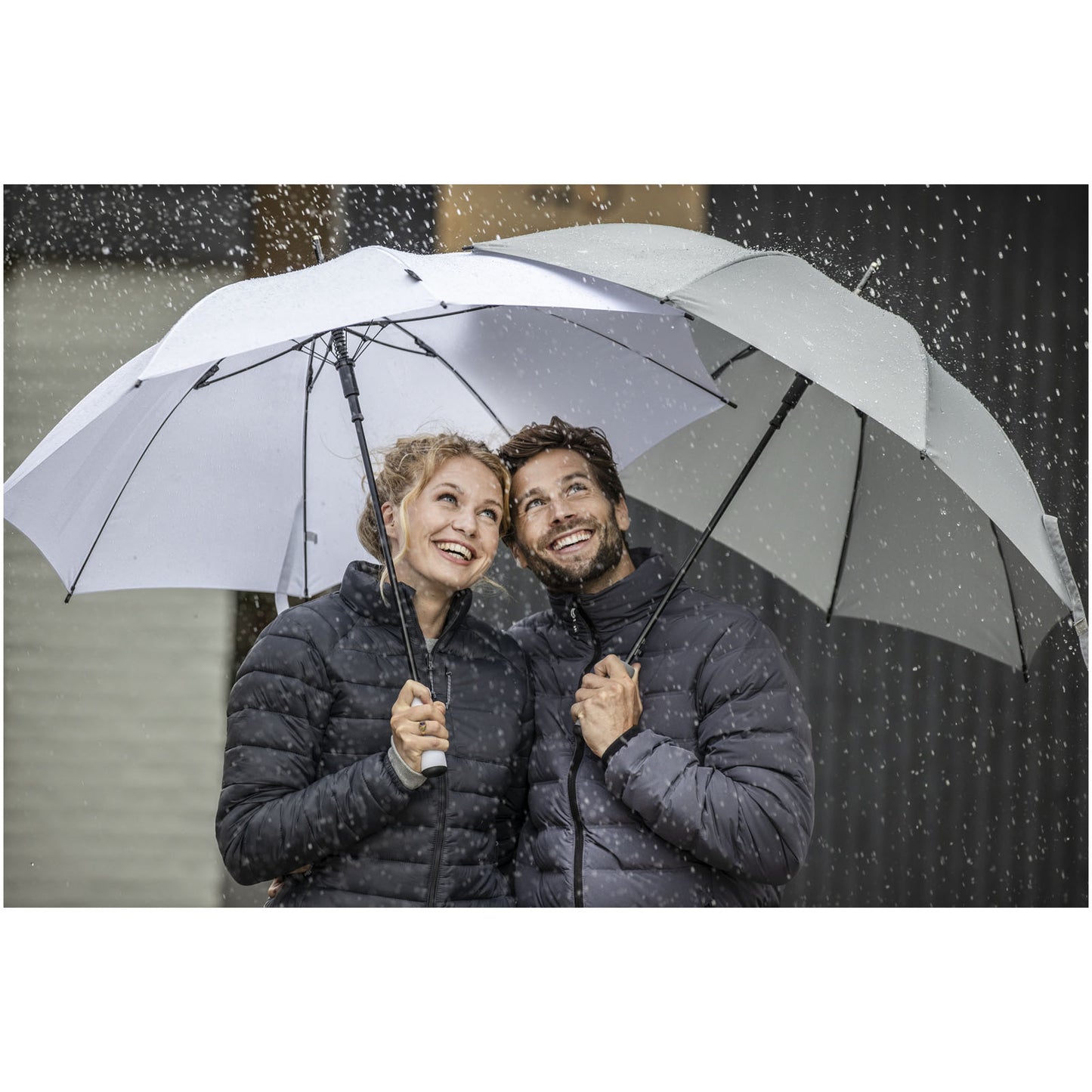 "Ombrello ad apertura automatica da 23” con telo in poliestere pongee in PET riciclato. Presenta una robusta asta in metallo, un telaio in fibra di vetro e un comodo manico in EVA con estremità in colore abbinato. Ampia superficie di stampa presente su ogni pannello."