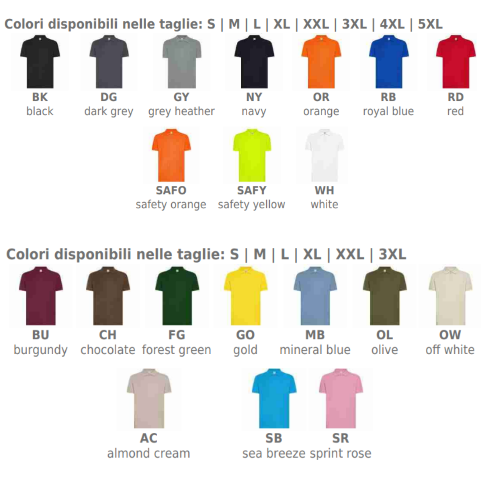 100% cotone piqué. Polo a costina piatta sul colletto e orlo delle maniche, 3 bottoni tono su tono, nastro di rinforzo al collo, struttura con cuciture e spacchetti laterali. Etichetta strappabile. Composizione: Grey Heather: 85% cotone 15% viscosa Safety Orange- Safety yellow: 80% poliestere 20% cotone.