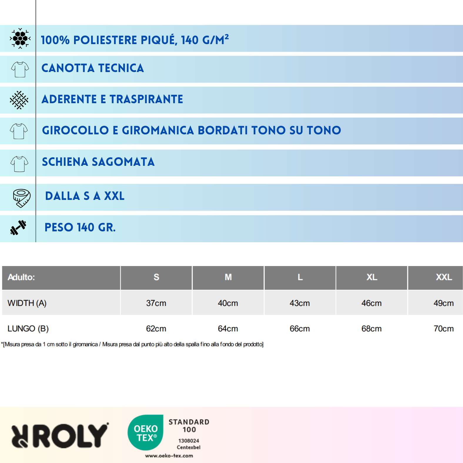 Tessuto tecnico, traspirante, facile da lavare e si asciuga rapidamente. Giromanica e scollatura a costine. Incrociato sulla schiena e con cuciture laterali. Etichetta rimovibile. Piqué con finiture cool fit 100% Poliestere, 140 g/m2.