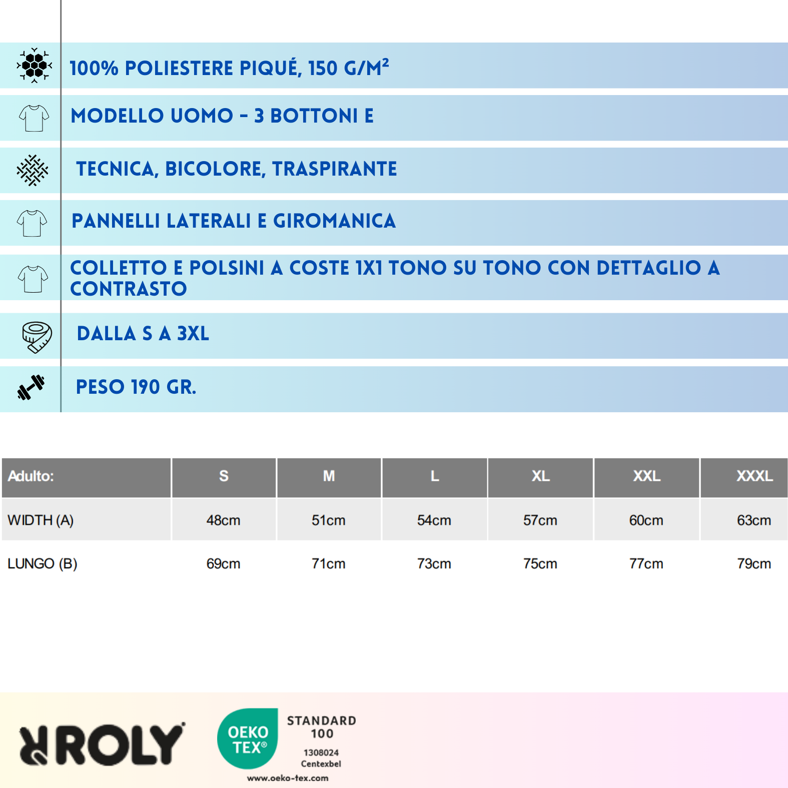Combinazione di due colori. Colletto con bottoni, cuciture coperte e pattina in colore a contrasto. Tessuto tecnico traspirante, facile da lavare e si asciuga rapidamente. Etichetta rimovibile. Piqué con finiture cool fit 100% Poliestere, 150 g/m2.