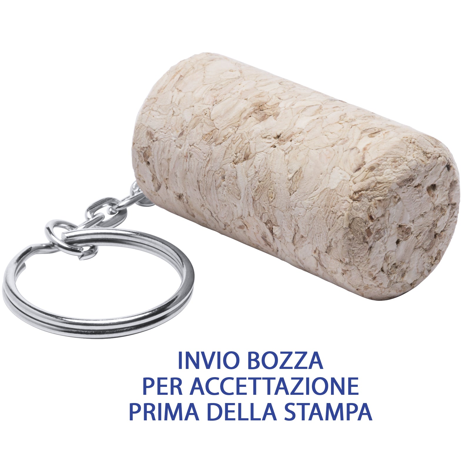 Portachiavi pubblicitari con stampa,modello realizzato in sughero, anello e catenina in metallo. Stampa a colori inclusa