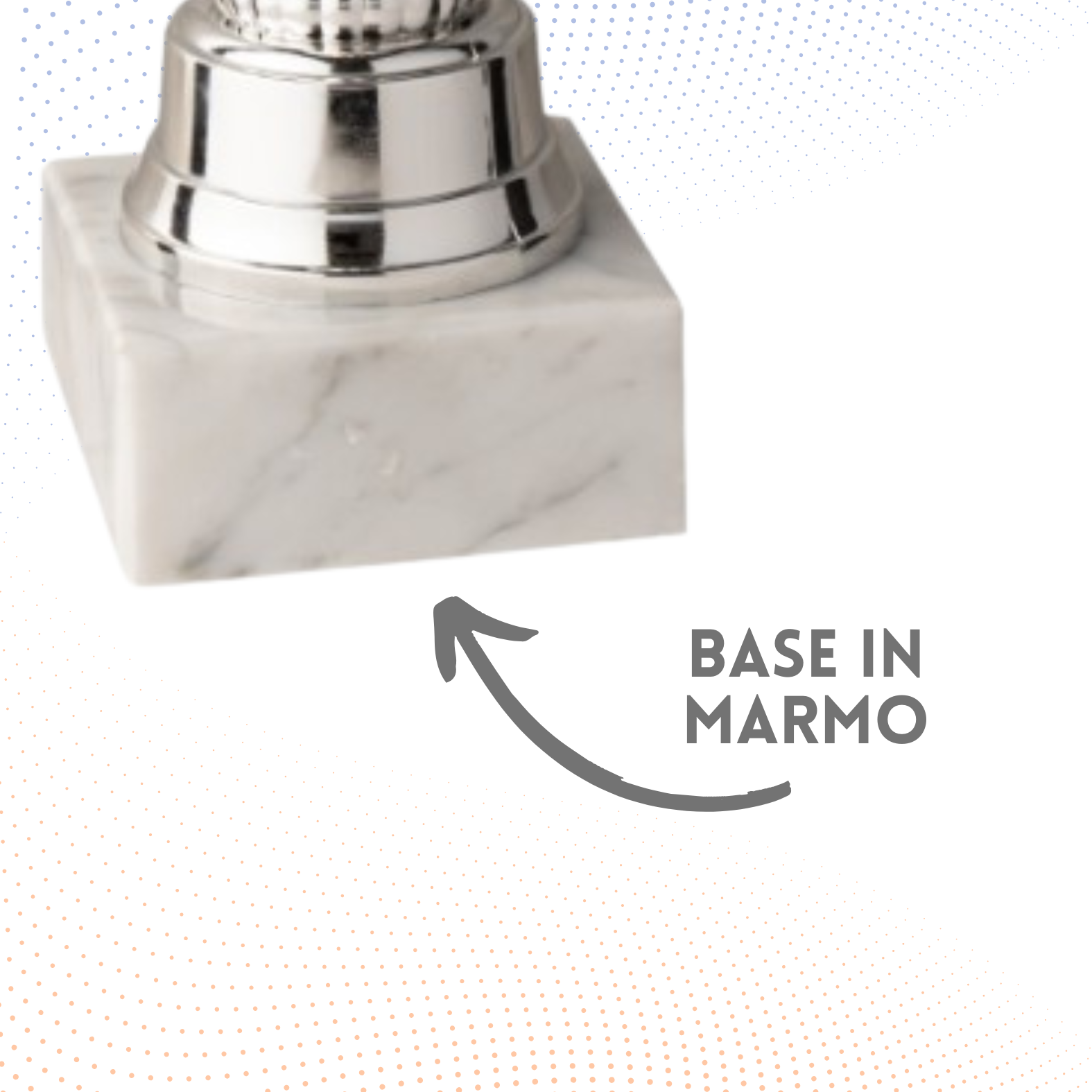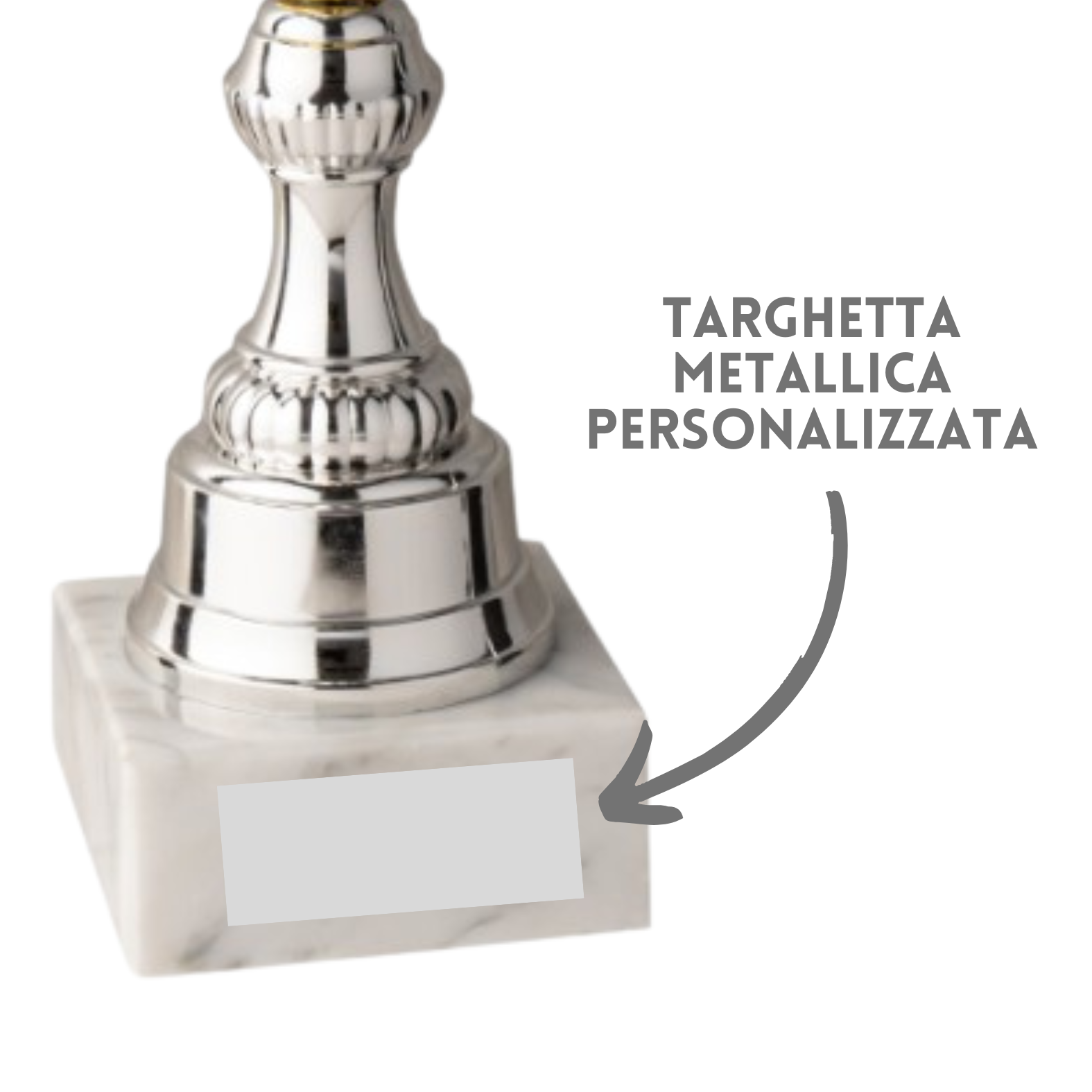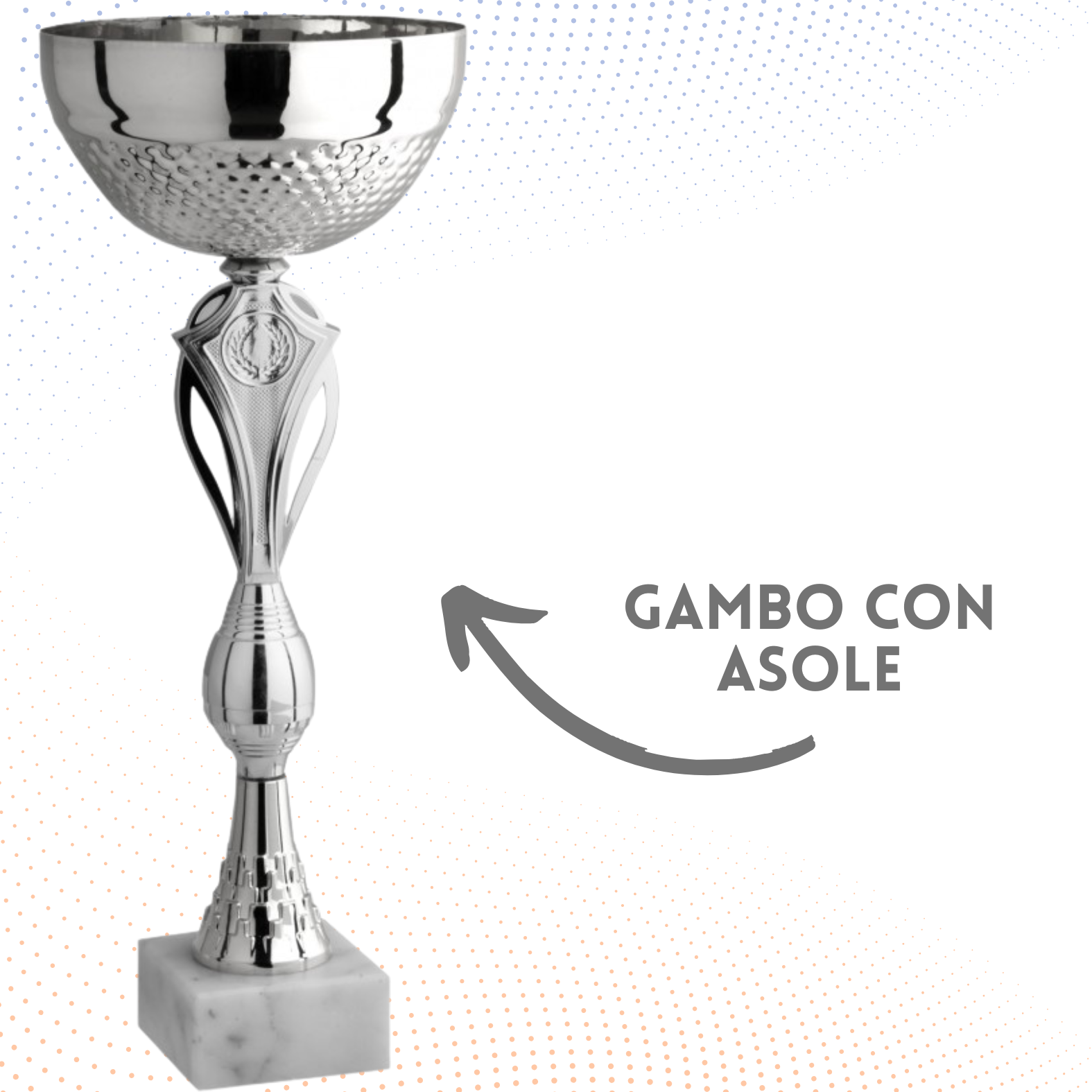 Tazza in metallo, gambo in metallo e plastica, base in marmo, colore Oro. Coppa con gambo disegnato con forme geometriche innovative, realizzato prevalentemente con un componente unico, la tazza di nuova realizzazione presente elementi puntinati sulla parte inferiore e un'ampia parte liscia e semplice in quella superiore. Targhetta con stampa a colori inclusa nel prezzo.