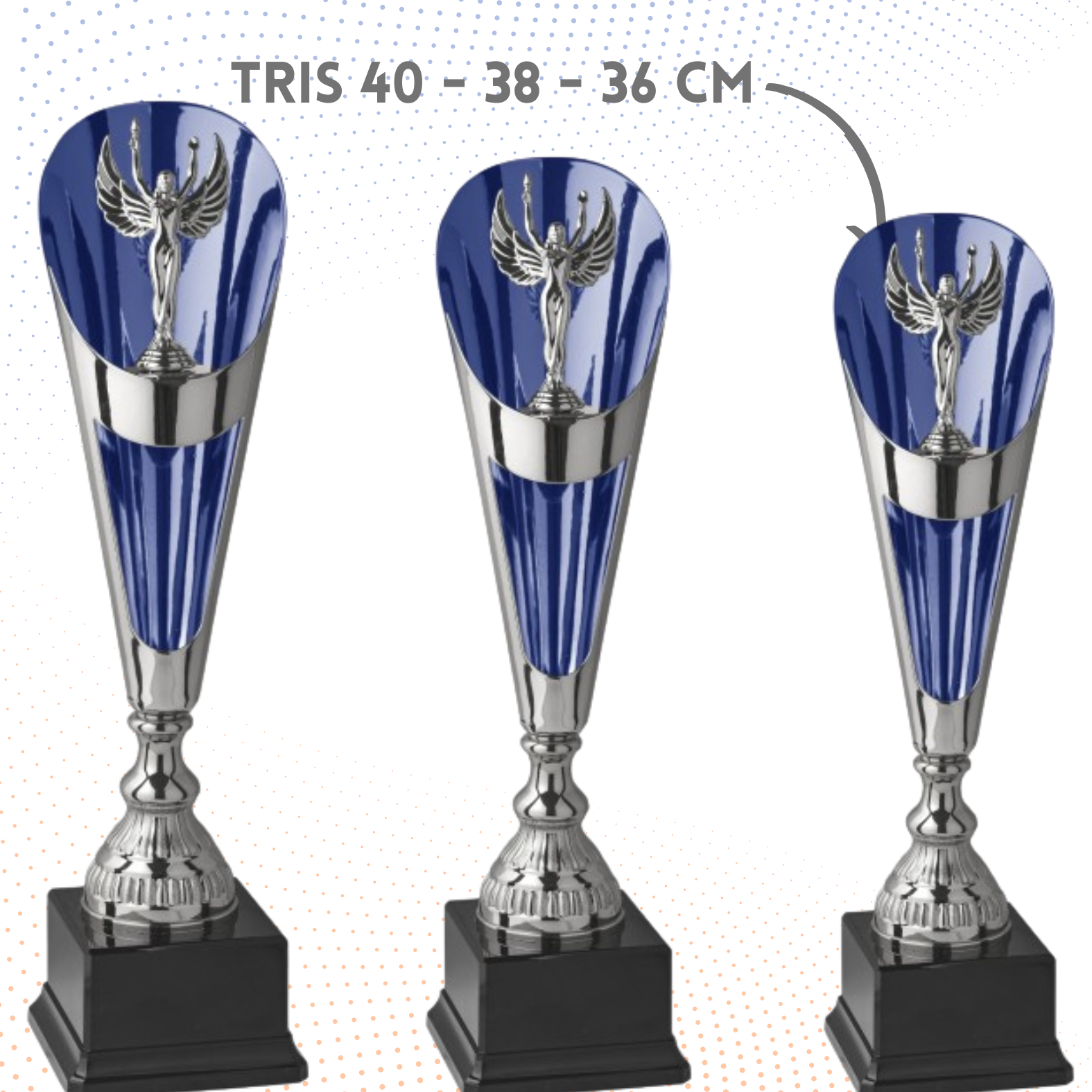 Set competo di premiazioni calcistiche contenente tris di coppe da 40 - 38 - 36 in ABS con statuietta della vittoria all'interno e fondo blu, 1 statuetta premio miglior giocatore e 1 statuetta miglior portiere. Tutti i pezzi del set vengono forniti con targhetta in metallo inclusa nel prezzo di acquisto.
