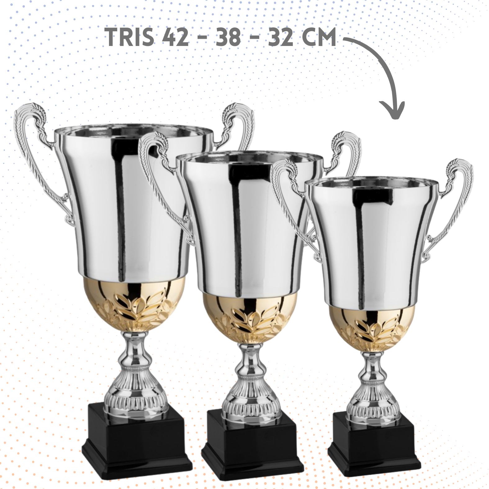 Set competo di premiazioni calcistiche contenente tris di trofei con manici da 42 - 38 - 32 cm con tazza in metallo, 1 premio scarpetta miglior portiere da 22 cm ed 1 premio miglior portiere in resina da 17 cm. Tutti i pezzi del set vengono forniti con targhetta in metallo inclusa nel prezzo di acquisto.