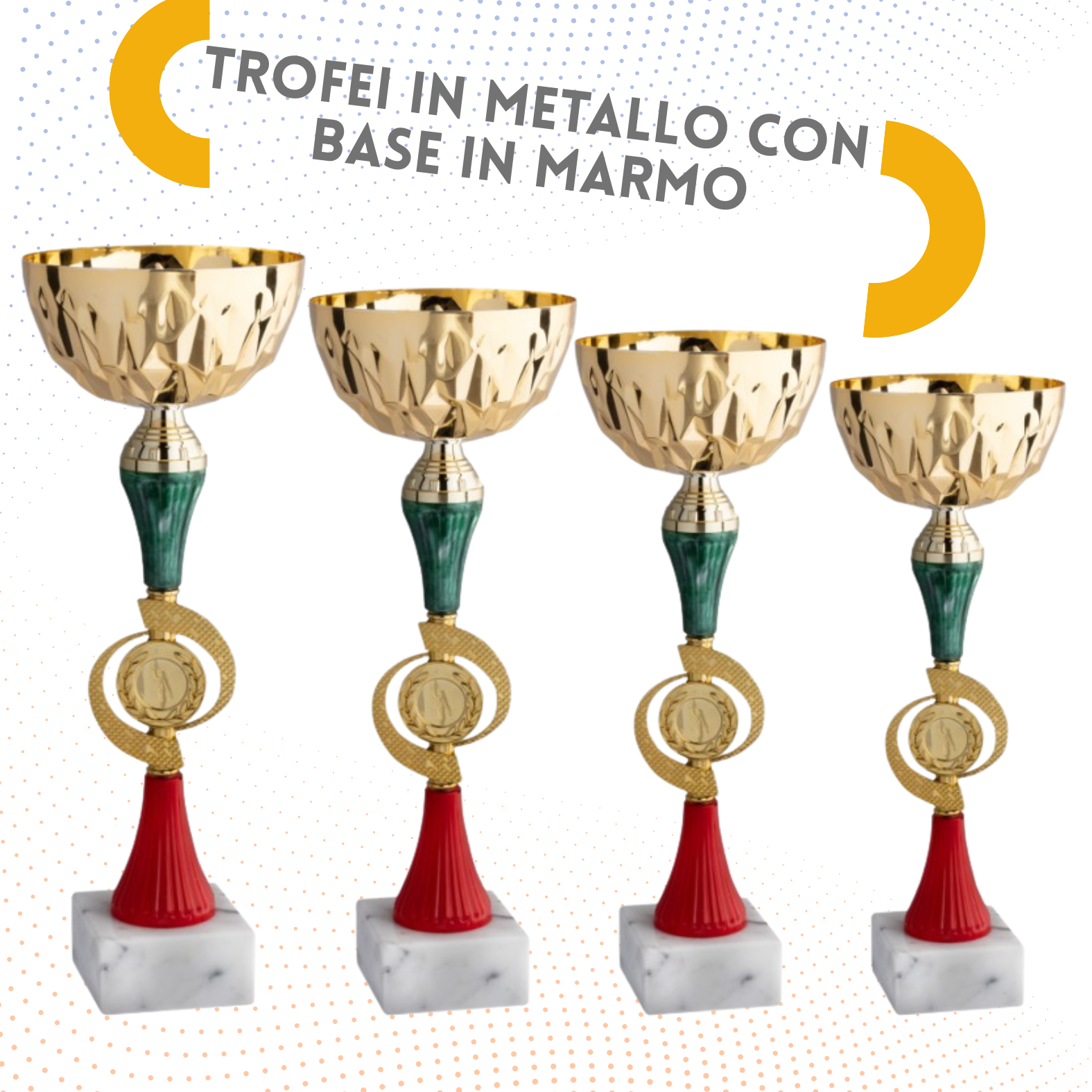 Set competo di premiazioni calcistiche contenente tris di coppe da 40 - 37 - 35 - 33 cm con fusto tricolore in ABS e base in marmo, premio miglior giocatore da 22 cm e premio portiere da 19 cm. Tutti i pezzi del set vengono forniti con targhetta in metallo inclusa nel prezzo di acquisto.