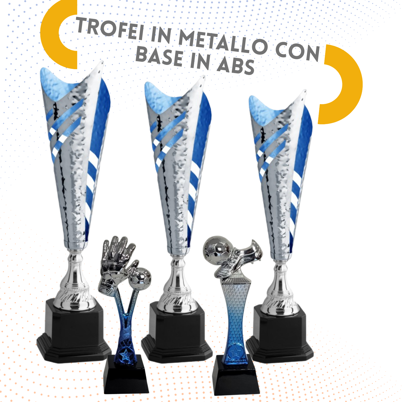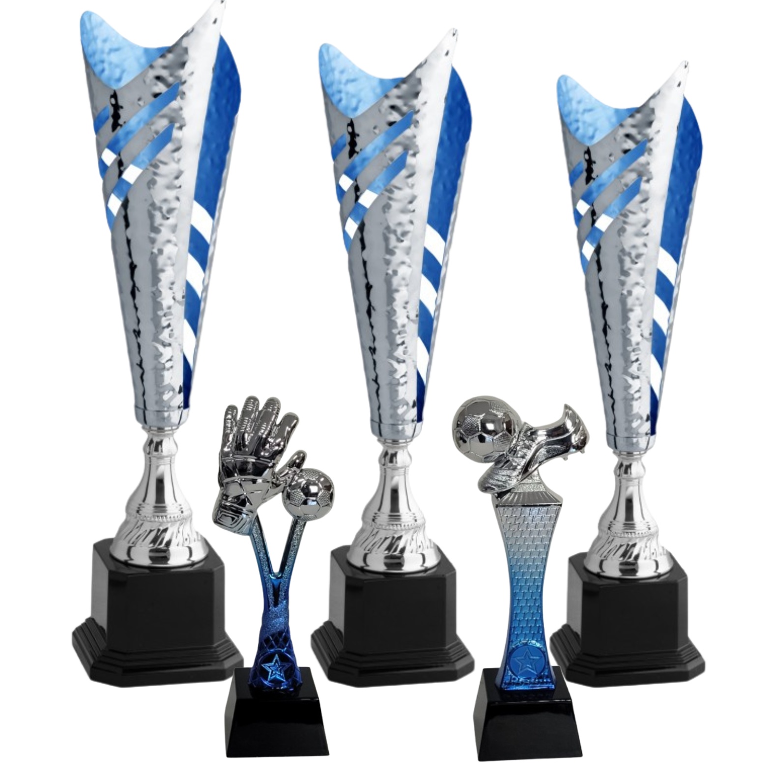 Set competo di premiazioni calcistiche contenente tris di coppe da 36 - 34 - 31 cm a forma di cono silver e base in marmo, premio miglior giocatore da 13 cm e premio portiere da 19 cm. Tutti i pezzi del set vengono forniti con targhetta in metallo inclusa nel prezzo di acquisto.
