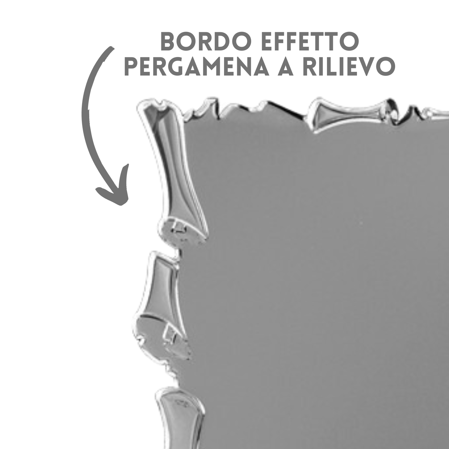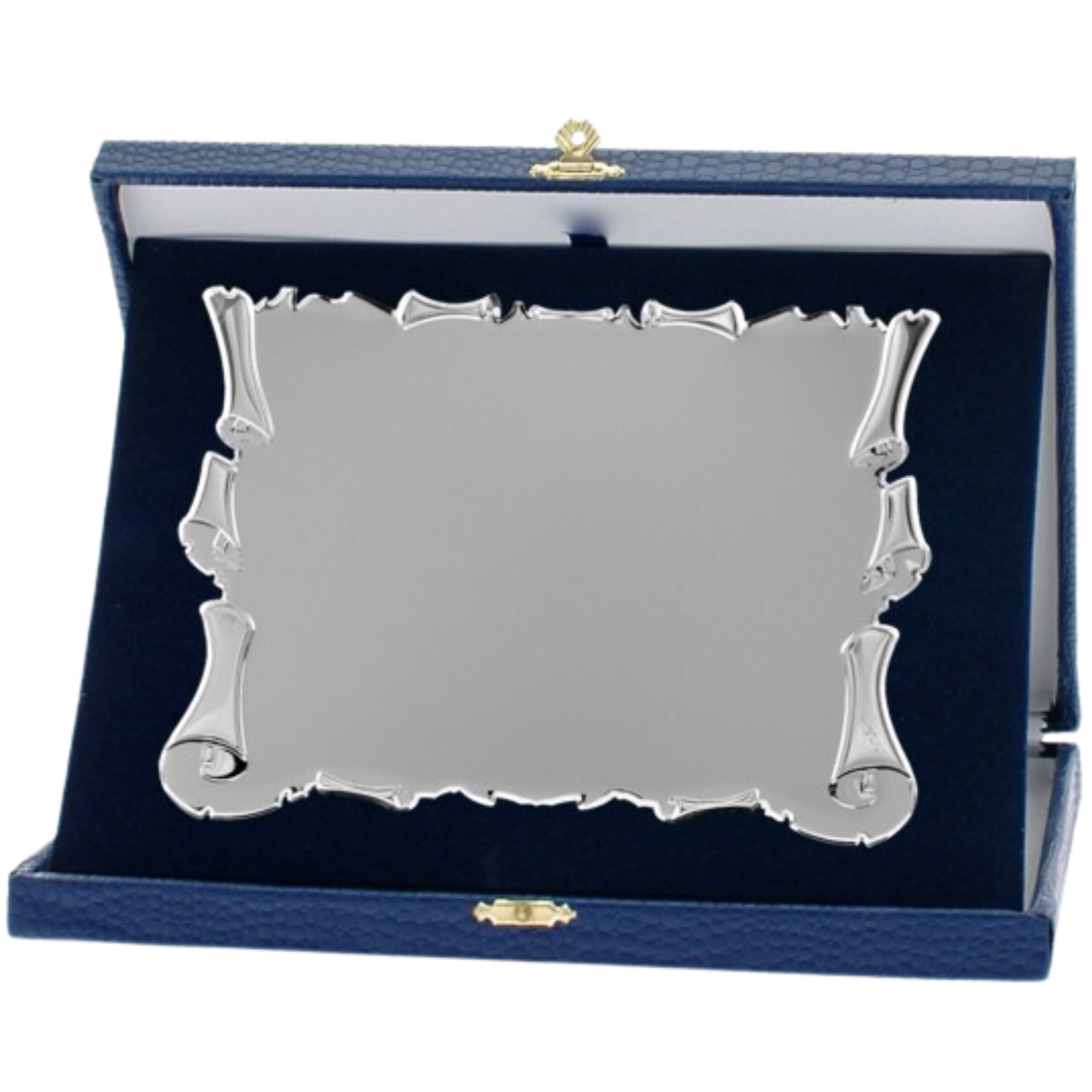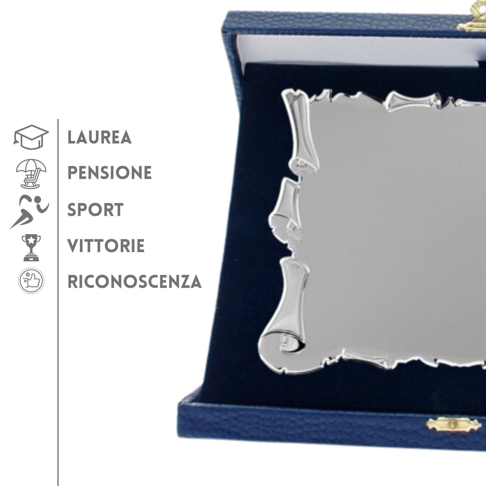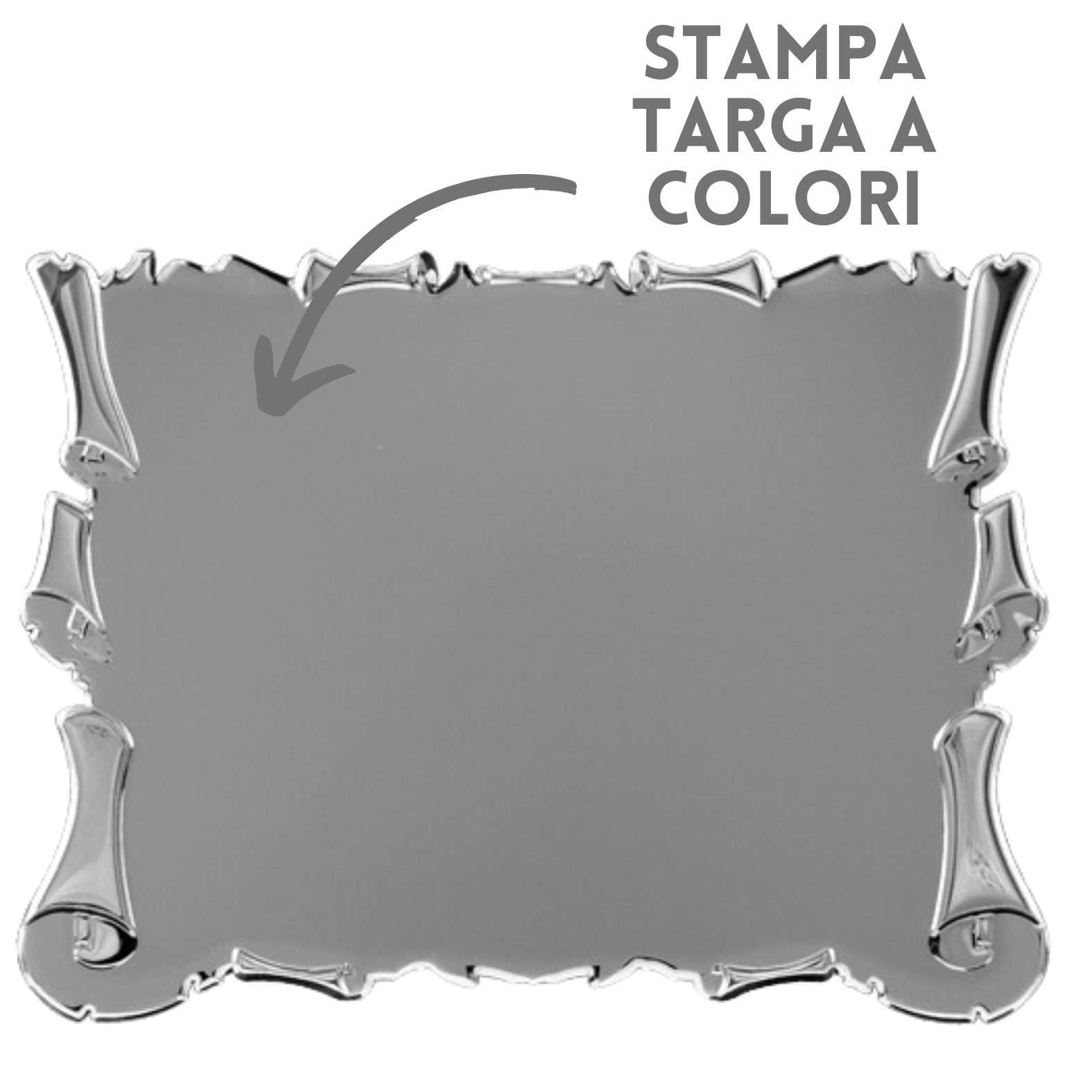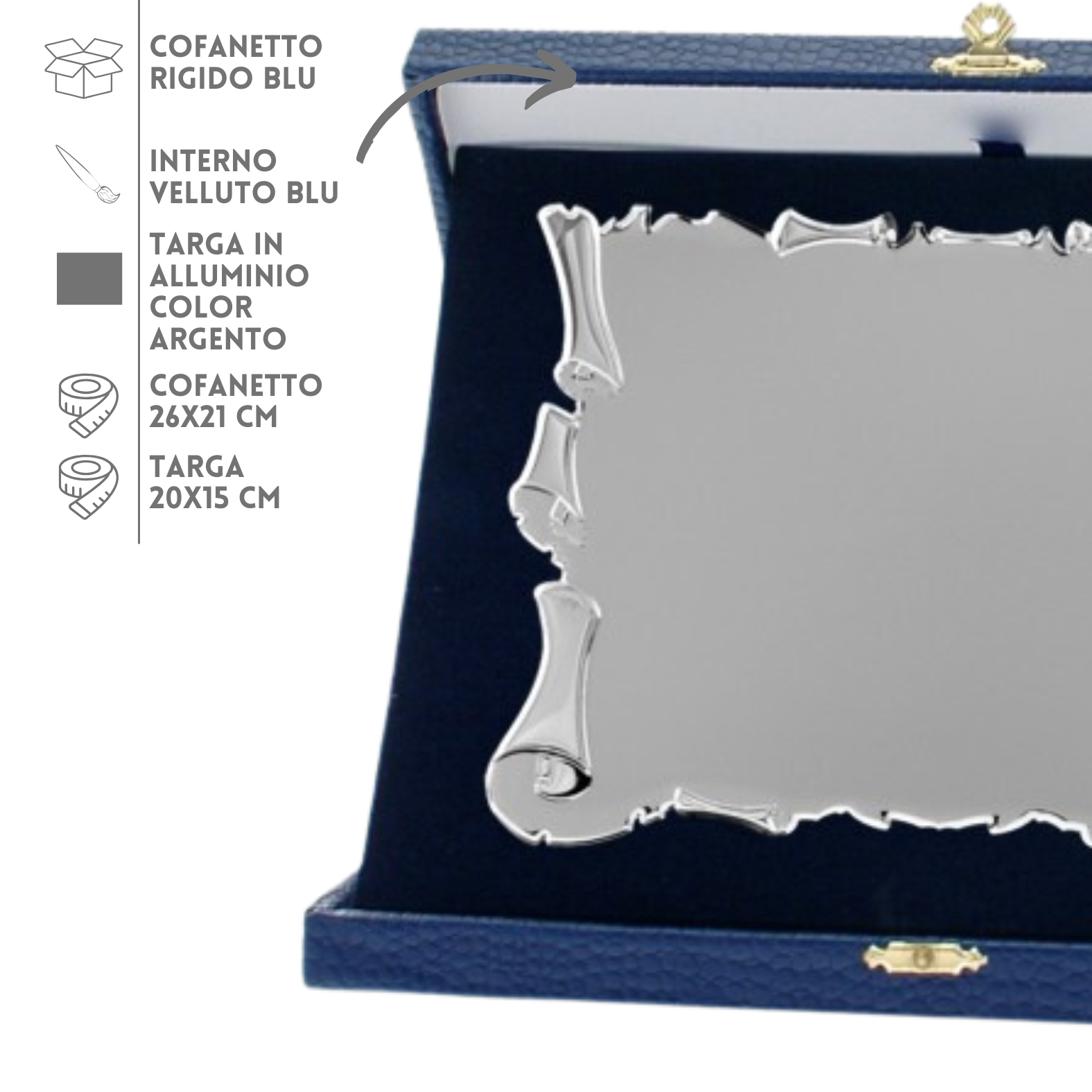 Set completo composto da targa in alluminio color silver a forma di pergamena dai bordi a rilievo, misura cofanetto 26x21 cm, misura targa 20x15 cm. Stampa targa a colori inclusa nel prezzo di acquisto.