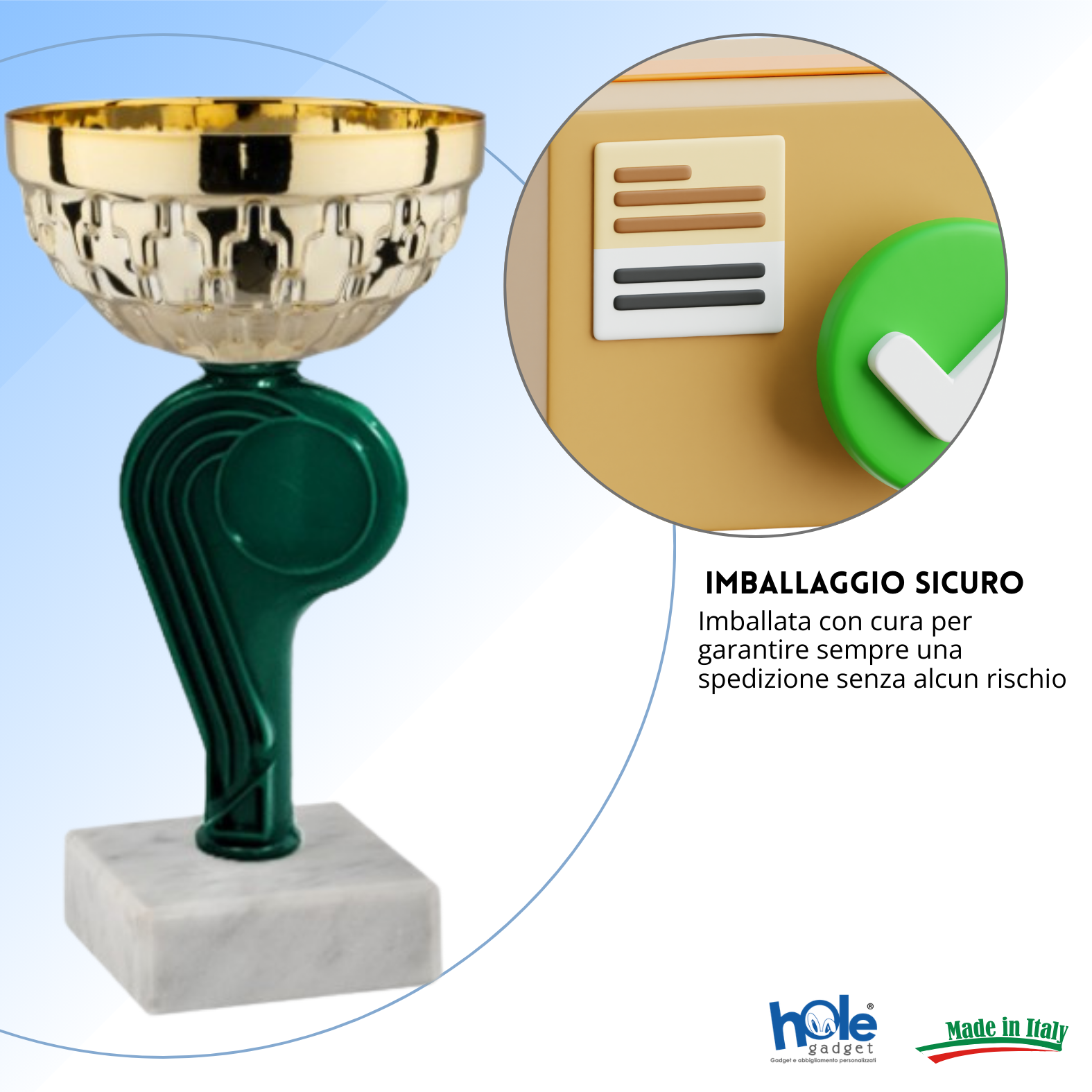 Tris di premiazioni personalizzate composto da 3 coppe da 15 cm ciascuna con la particolarità della composizione del colore del fusto a formare il tricolore italiano. Targhetta in metallo inclusa nel prezzo.