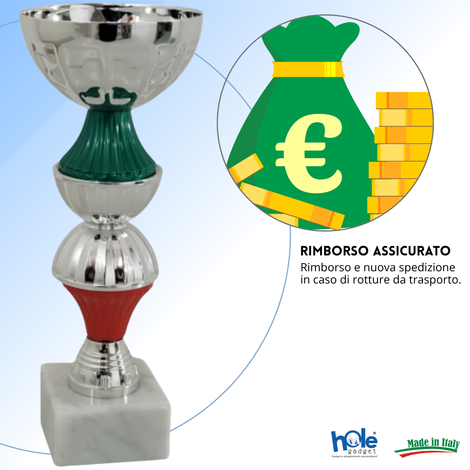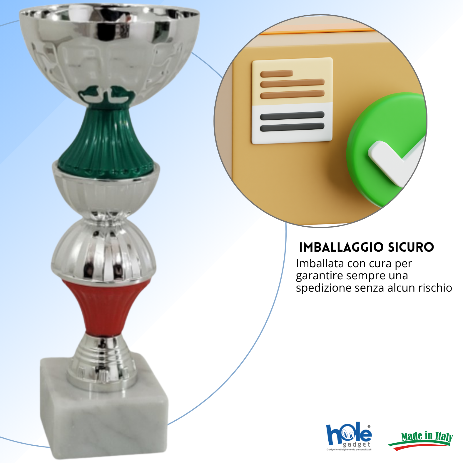 Tazza in metallo, gambo in plastica, base in marmo, colore Silver. Coppa piccola con particolari in verde e rosso e un elemento nuovo accoppiato a forma di doppia semisfera, tazza nuova di produzione italiana. Targhetta in metallo inclusa nel prezzo.