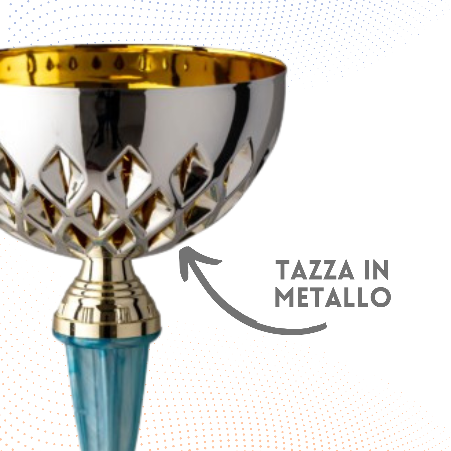 Tazza in metallo, gambo in plastica, basi in marmo , colore Argento. Trofeo con due basi in marmo bianco Carrara. Realizzato per contenere molto il costo e garantire una dimensione non modesta, presenta una tazza in metallo particolarmente innovativa traforata e bicolore. Targhetta in metallo inclusa nel prezzo.