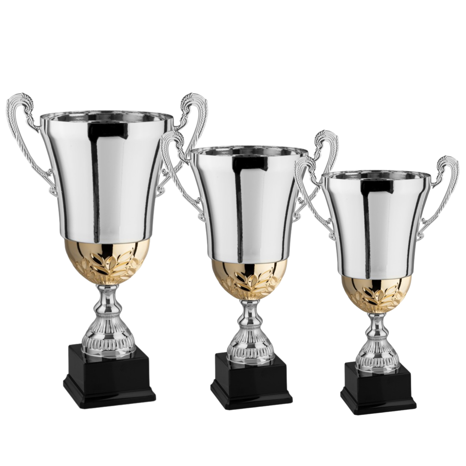 Tazza in metallo, gambo in plastica, base in plastica e resina, colore Argento. Trofeo argento lucido dal disegn semplice con riporto in oro, si avvicina molto allo stile della Coppa Italia, disponibile in 6 dimensioni, completo di manici classici in metallo. Fornite con targhetta metallica personalizzata inclusa.