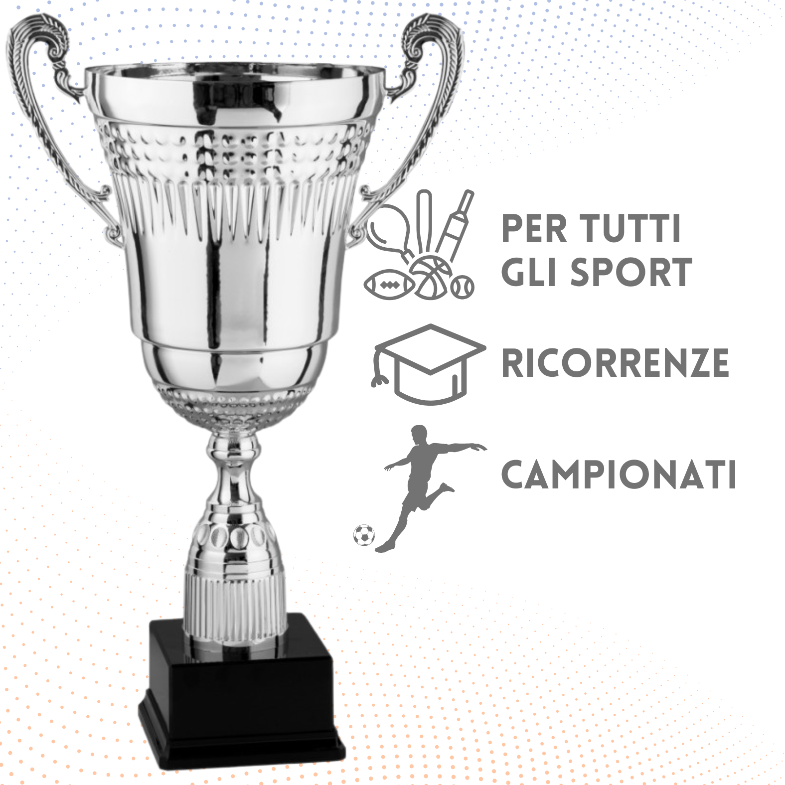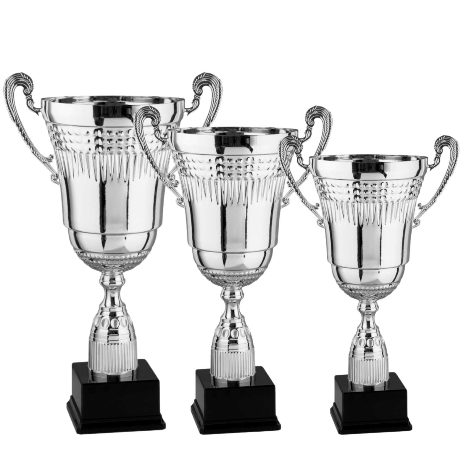 Tazza in metallo, gambo in plastica, base in plastica e resina, colore Argento. Trofeo elegante e conveniente, le lavorazioni presenti in tutta la superfice sono sobrie e caratterizzanti, disponibile in ben 6 dimensioni, completo di manici classici in metallo. Fornite con targhetta metallica personalizzata inclusa.