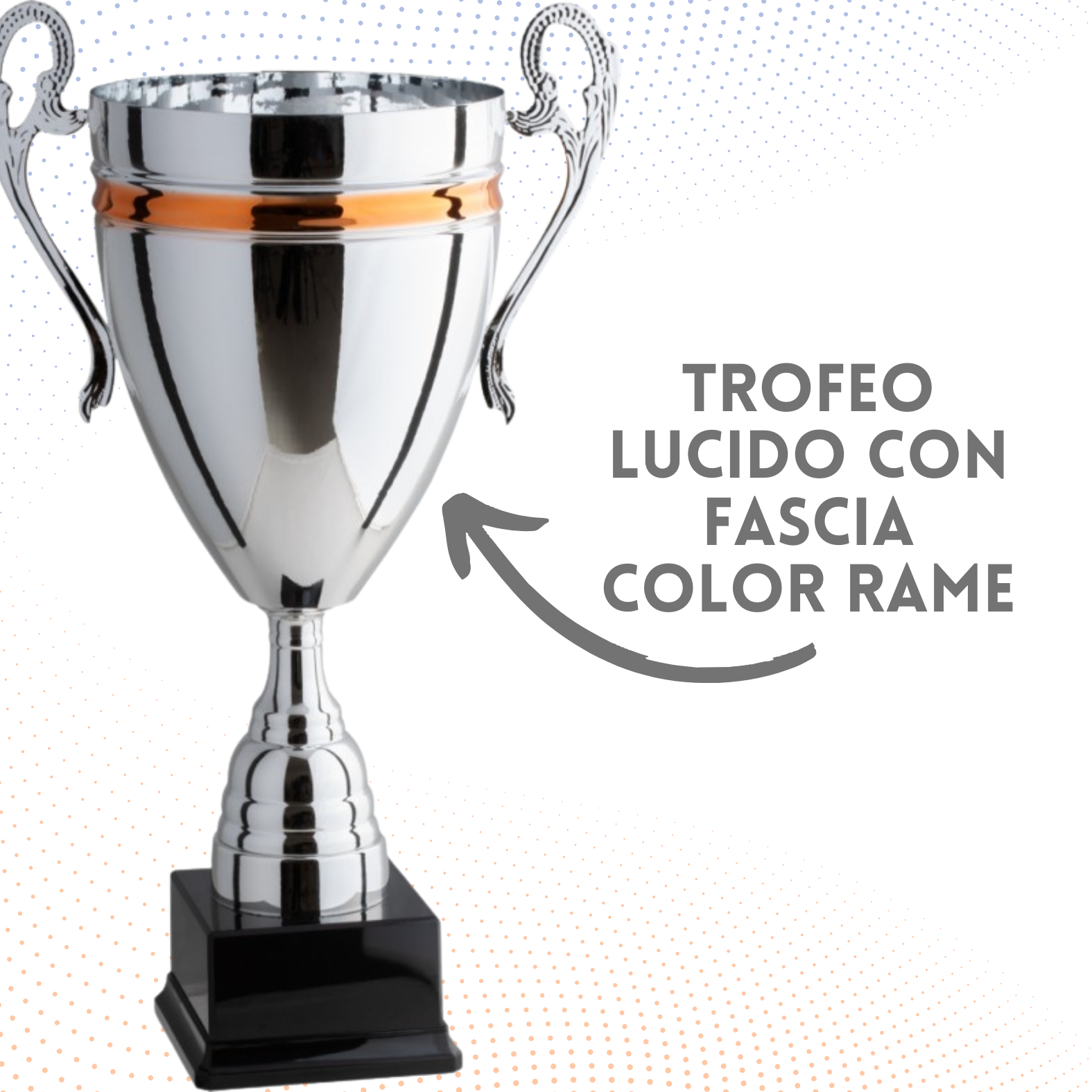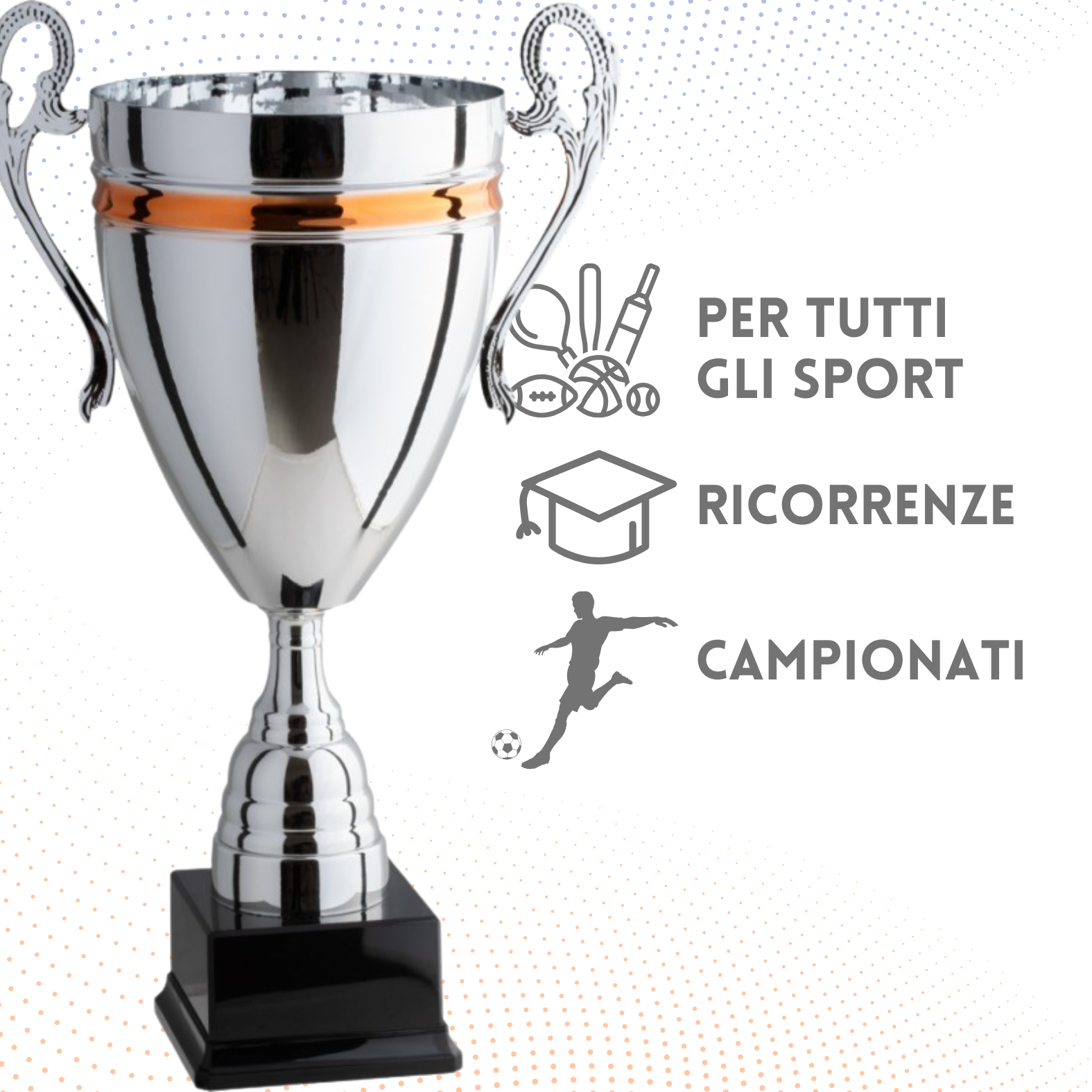 Tazza con manici in metallo argentato con fascia color rame, gambo in metallo e plastica argentata, base in plastica e resina., colore Argento/Rame. Trofeo classico con manici con lo speciale riporto in colore rame che ne esalta l'eleganza e lo stile classico con un tocco di innovazione. Il prodotto è adatto ad accompagnare la conclusione degli eventi più prestigiosi e di classe, per qualsiasi disciplina sportiva, evento culturale o rappresentanza Targhetta in metallo inclusa nel prezzo.