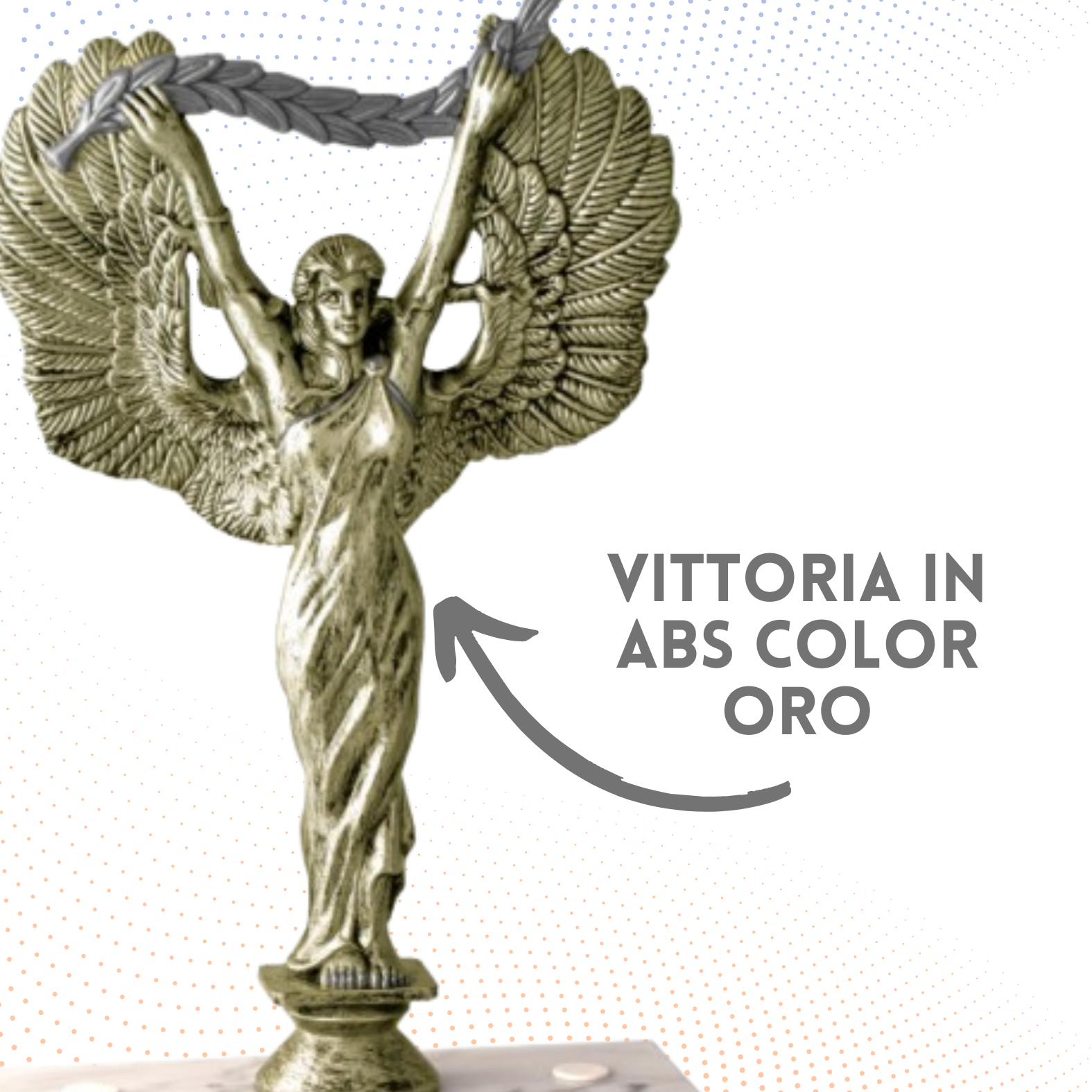 Statuetta e gambo in plastica, basi in marmo , colore Oro. Trofeo con due basi in marmo e vittoria in abs color argento invecchiato con riporti in oro. Targhetta in metallo inclusa nel prezzo.