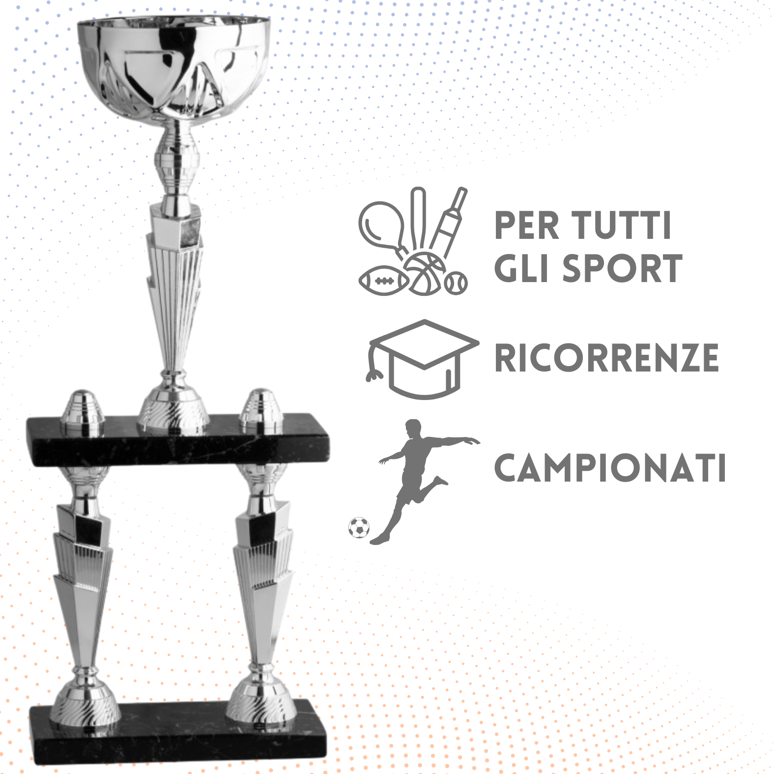 Tazza in metallo argentato, basi in marmo nero, gambi in plastica argentata, colore Argento. Trofeo a doppia base e piedistallo con elementi prismatici nuovissimi di grande stile, così come il colore nero del marmo utilizzato, un'assoluta novità per la nuova collezione. Targhetta in metallo inclusa nel prezzo.